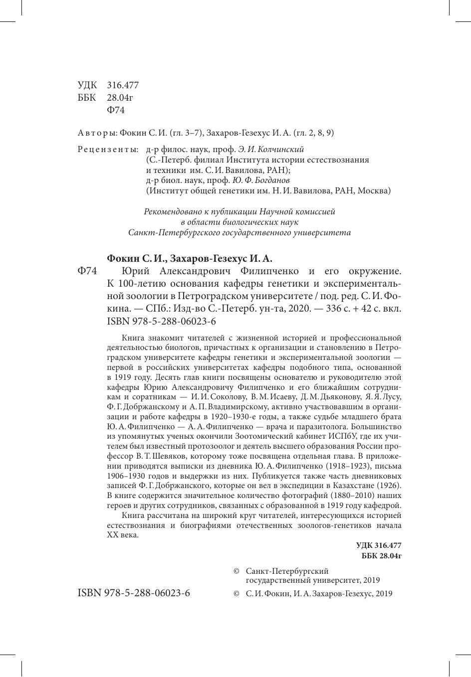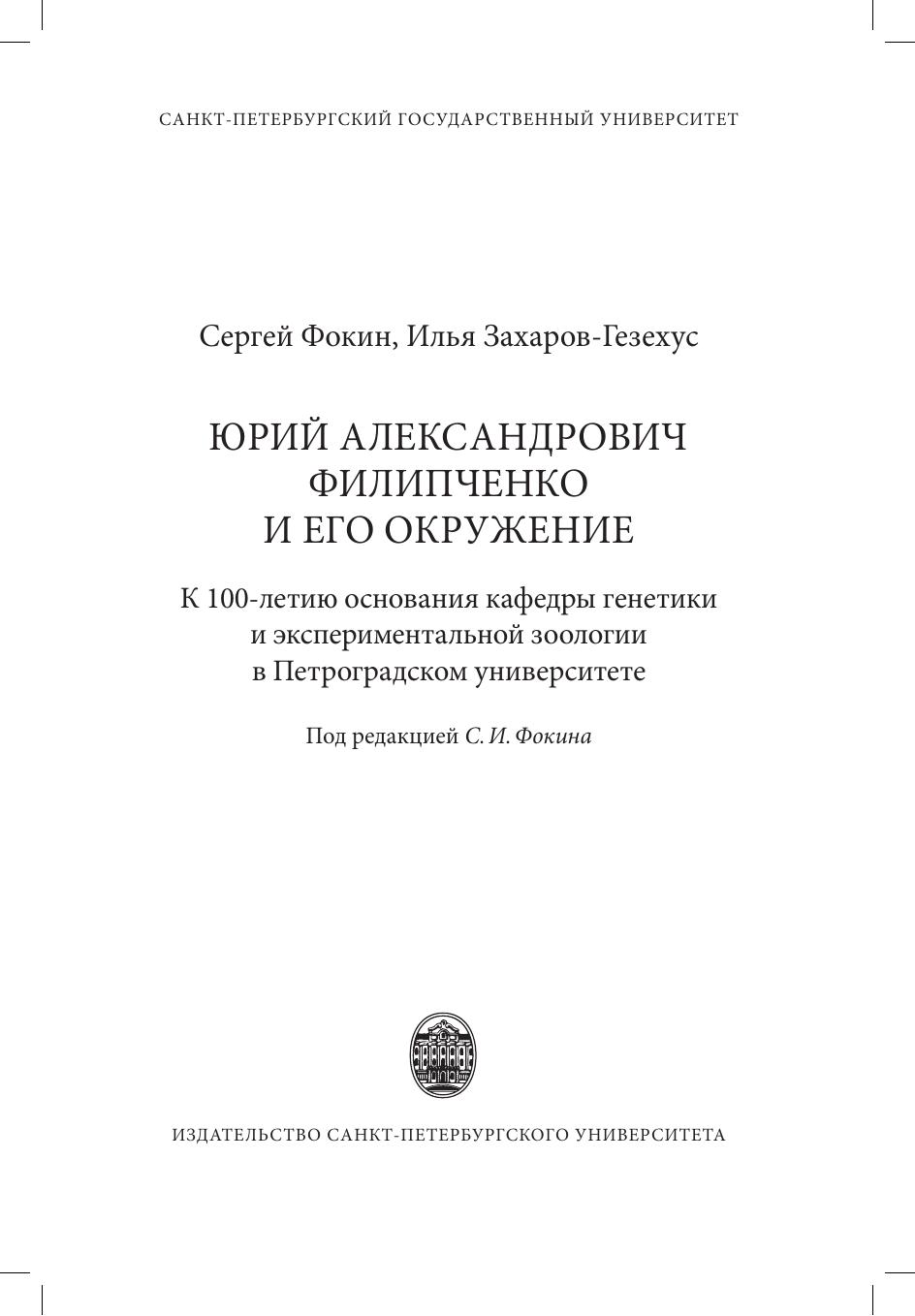 Юрий Александрович Филипченко и его окружение. К 100-летию основания кафедры генетики и экспериментальной зоологии в Петроградском университете