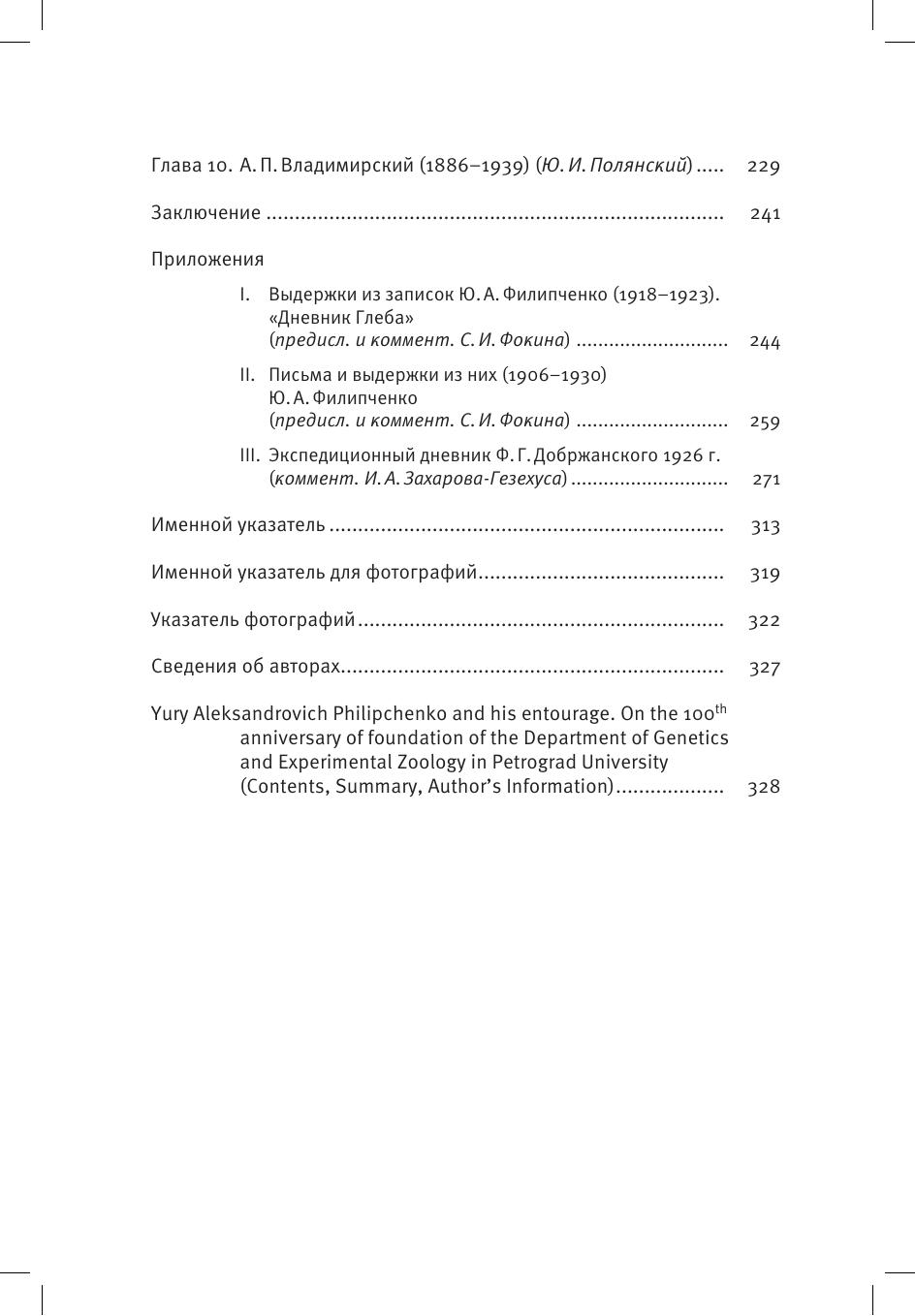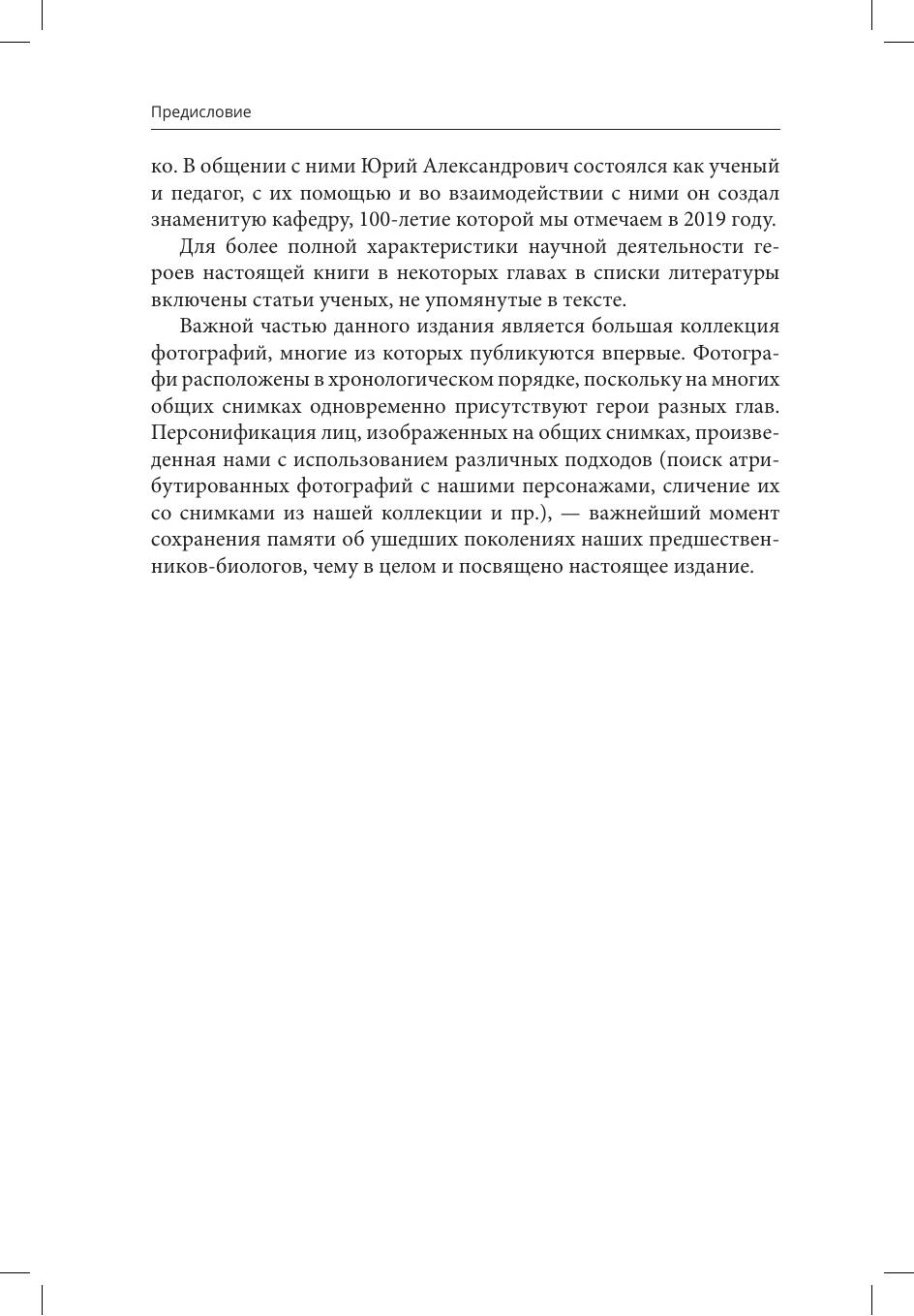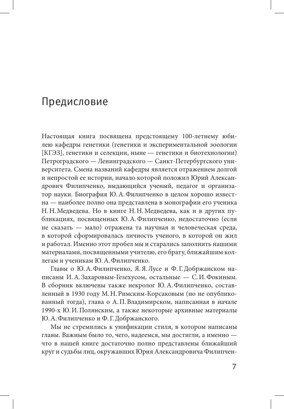Книга знакомит читателей с жизненной историей и профессиональной деятельностью биологов, причастных к организации и становлению в Петроградском университете кафедры генетики экспериментальной зоологии - первой в российских университетах кафедры подобного типа, основанной в 1919 году. Десять глав книги посвящены основателю и руководителю этой кафедры - Юрию Александровичу Филипченко и его ближайшим сотрудникам и соратникам - И.И.Соколову, В.М. Исаеву, Д.М. Дьяконову, Я.Я.Лусу, Ф.Г.Добржанскому и А.П.Владимирскому, активно участвовавшим в организации и работе кафедры в 1920-1930 голы, а также судьбе младшего брата Ю.А.Филипченко - А.А.Филипченко - врача и паразитолога. Большинство из упомянутых ученых окончили зоотомический кабинет ИСПбУ, где их учителем был известный протозоолог и деятель высшего образования России профессор В.Т.Шевяков, которому посвящена отдельная глава. В приложении приводятся выписки из дневника Ю.В.Филипченко (1918-1923), письма 1906-1930 годов и выдержки из них. Публикуется часть дневниковых записей Ф.Г.Добржанского, которые он вел в экспедиции в Казахстане (1926). В книге содержится значительное количество фотографий (1880-2010) наших героев и других сотрудников, связанных с образованной в 1919 году кафедрой.