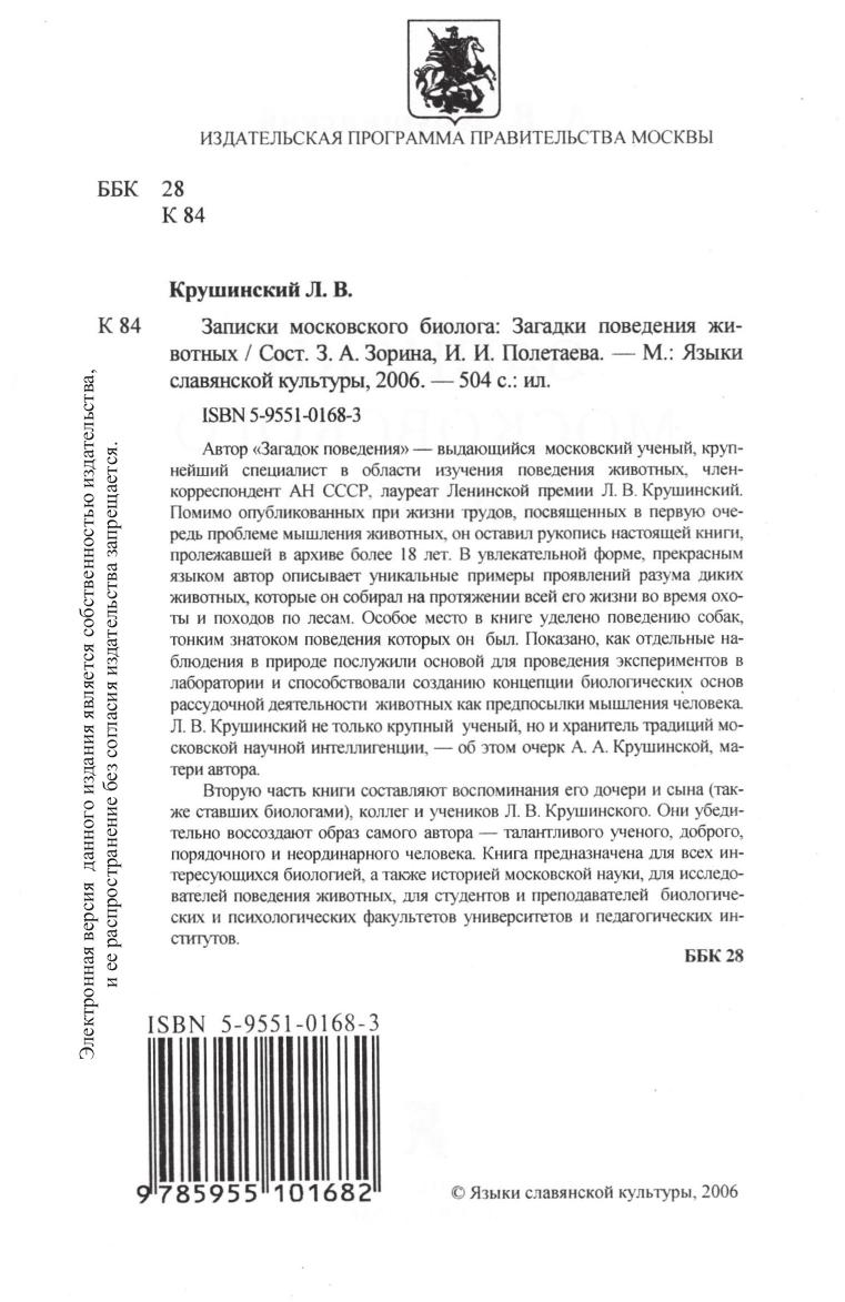 Автор «Загадок поведения» — выдающийся московский ученый, крупнейший специалист в области изучения поведения животных, член- корреспондент АН СССР, лауреат Ленинской премии Л.В. Крушинский. Помимо опубликованных при жизни трудов, посвященных в первую очередь проблеме мышления животных, он оставил рукопись настоящей книга, пролежавшей в архиве более 18 лет. В увлекательной форме, прекрасным языком автор описывает уникальные примеры проявлений разума диких животных, которые он собирал на протяжении всей его жизни во время охоты и походов по лесам. Особое место в книге уделено поведению собак, тонким знатоком поведения которых он был. Показано, как отдельные наблюдения в природе послужили основой для проведения экспериментов в лаборатории и способствовали созданию концепции биологических основ рассудочной деятельности животных как предпосылки мышления человека Л.В. Крушинский не только крупный ученый, но и хранитель традиций московской научной интеллигенции, — об этом очерк А.А. Крушинской, матери автора. Вторую часть книги составляют воспоминания его дочери и сына (также ставших биологами), коллег и учеников Л.В. Крушинского. Они убедительно воссоздают образ самого автора — талантливого ученого, доброго, порядочного и неординарного человека. Книга предназначена для всех интересующихся биологией, а также историей московской науки, для исследователей поведения животных, для студентов и преподавателей биологических и психологических факультетов университетов и педагогических институтов.