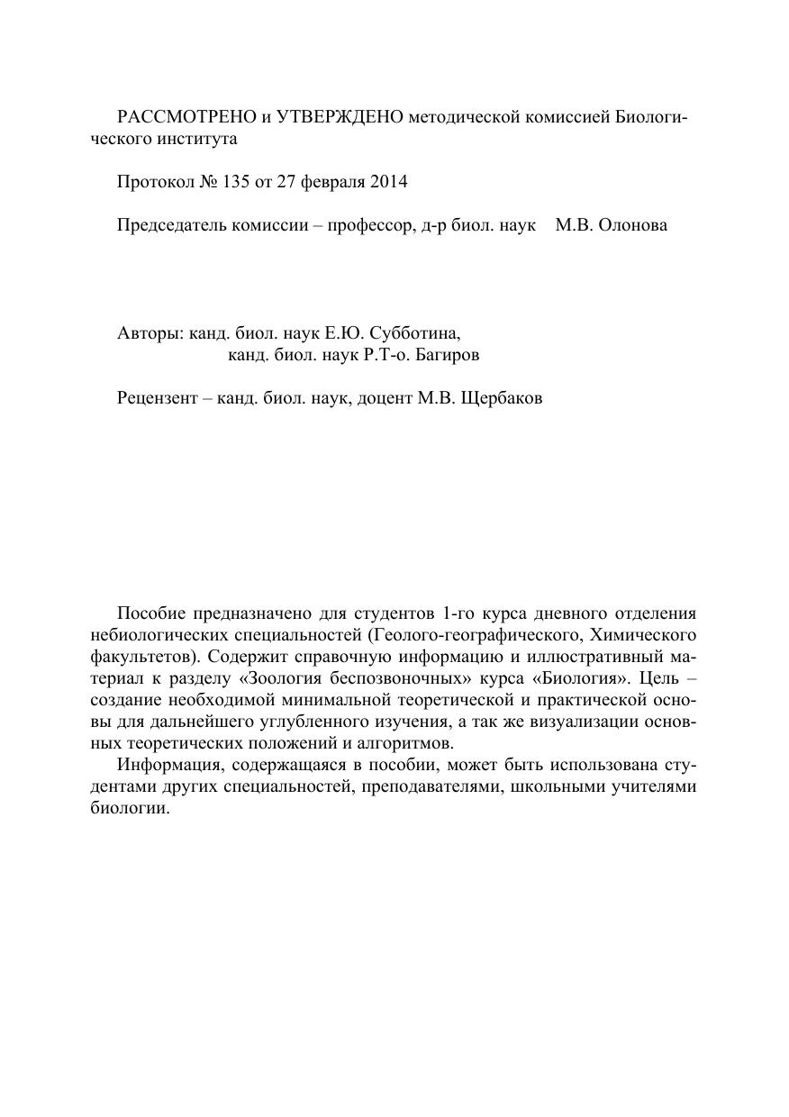 Пособие предназначено для студентов 1-го курса дневного отделения небиологических специальностей (Геолого-географического, Химического факультетов). Содержит справочную информацию и иллюстративный материал к разделу «Зоология беспозвоночных» курса «Биология». Цель - создание необходимой минимальной теоретической и практической основы для дальнейшего углубленного изучения, а так же визуализации основных теоретических положений и алгоритмов. Информация, содержащаяся в пособии, может быть использована студентами других специальностей, преподавателями, школьными учителями биологии.