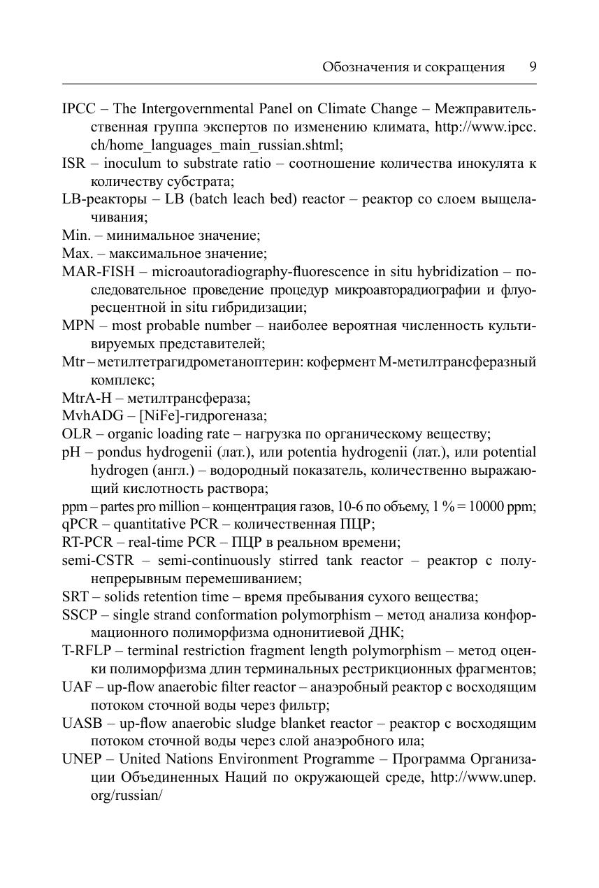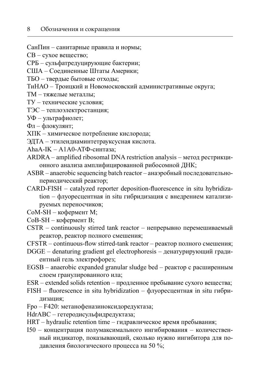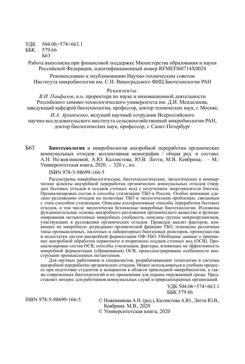 Рассмотрены микробиологические, биотехнологические, экологические и коммерческие аспекты анаэробной переработки органических коммунальных отходов (твердых бытовых отходов и осадков сточных вод) с получением энергоносителя биогаза. Проанализирован состав и способы утилизации ТБО в России. Особое внимание уделено разложению отходов на полигонах ТБО и экологическим проблемам, связанным с этим способом утилизации. Описаны альтернативные способы переработки бытовых отходов, в том числе экологически безопасные микробные биотехнологии. Изложены фундаментальные основы анаэробного разложения органического вещества и функционирования метаногенных микробных сообществ, описаны группы микроорганизмов, участвующих в разложении органических отходов. Проведен анализ факторов, влияющих на микробную деградацию органической фракции ТБО, освещены различные типы промышленных, пилотных и лабораторных биогазовых реакторов, преимущества и недостатки систем анаэробной ферментации ОФ-ТБО. Обобщены данные о принципах анаэробной обработки первичного и вторичного осадков сточных вод (ОСВ). Проанализирован состав ОСВ, способы утилизации, факторы, влияющие на эффективность микробной ферментации (сбраживания) ОСВ, проиллюстрированы особенности конструкции промышленных метантенков. Для научных работников и специалистов, разрабатывающих технологии и системы анаэробной переработки органических отходов. Может использоваться в учебном процессе при подготовке студентов и аспирантов в области прикладной микробиологии, а также современных биотехнологий и их применения для охраны окружающей среды. Представляет интерес для работников коммунальных служб и природоохранных организаций.