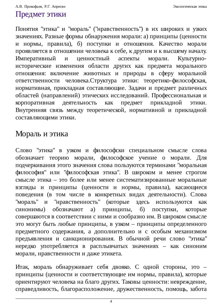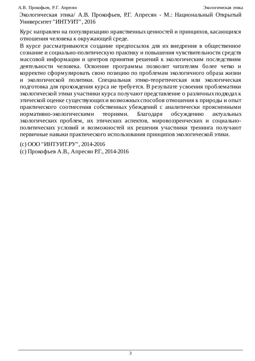 Курс направлен на популяризацию нравственных ценностей и принципов, касающихся отношения человека к окружающей среде. В курсе рассматриваются создание предпосылок для их внедрения в общественное сознание и социально-политическую практику и повышения чувствительности средств массовой информации и центров принятия решений к экологическим последствиям деятельности человека. Освоение программы позволит читателям более четко и корректно сформулировать свою позицию по проблемам экологичного образа жизни и экологической политики. Специальная этико-теоретическая или экологическая подготовка для прохождения курса не требуется. В результате усвоения проблематики экологической этики участники курса получают представление о различных подходах к этической оценке существующих и возможных способов отношения к природы и опыт практического соотнесения собственных убеждений с аналитически проясненными нормативно-экологическими теориями. Благодаря обсуждению актуальных экологических проблем, их этических аспектов, мировоззренческих и социально-политических условий и возможностей их решения участники тренинга получают первичные навыки практического использования принципов экологической этики.