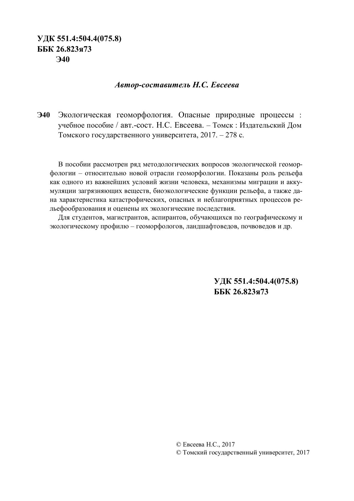 В пособии рассмотрен ряд методологических вопросов экологической геоморфологии – относительно новой отрасли геоморфологии. Показаны роль рельефа как одного из важнейших условий жизни человека, механизмы миграции и аккумуляции загрязняющих веществ, биоэкологические функции рельефа, а также дана характеристика катастрофических, опасных и неблагоприятных процессов рельефообразования и оценены их экологические последствия. Для студентов, магистрантов, аспирантов, обучающихся по географическому и экологическому профилю – геоморфологов, ландшафтоведов, почвоведов и др.