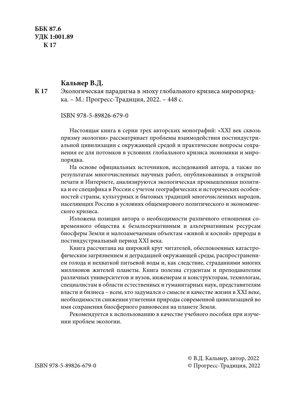 Настоящая книга в серии трех авторских монографий: «XXI век сквозь призму экологии» рассматривает проблемы взаимодействия постиндустриальной цивилизации с окружающей средой и практические вопросы сохранения ее для потомков в условиях глобального кризиса экономики и миропорядка. На основе официальных источников, исследований автора, а также по результатам многочисленных научных работ, опубликованных в открытой печати и Интернете, анализируются экологическая промышленная политика и ее специфика в России с учетом географических и исторических особенностей страны, культурных и бытовых традиций многочисленных народов, населяющих Россию в условиях общемирового политического и экономического кризиса. Изложена позиция автора о необходимости различного отношения современного общества к безальтернативным и альтернативным ресурсам биосферы Земли и малозамечаемым объектам «живой и косной» природы в постиндустриальный период XXI века. Книга рассчитана на широкий круг читателей, обеспокоенных катастрофическим загрязнением и деградацией окружающей среды, распространением голода и нехваткой питьевой воды и, как следствие, страданиями многих миллионов жителей планеты. Книга полезна студентам и преподавателям различных университетов и вузов, инженерам и конструкторам, технологам, специалистам в области естественных и гуманитарных наук, представителям власти и бизнеса – всем, кто задумался о смысле и качестве жизни в XXI веке, необходимости снижения угнетения природы современной цивилизацией во имя сохранения биосферного равновесия на планете Земля. Рекомендуется к использованию в качестве учебного пособия при изучении проблем экологии.