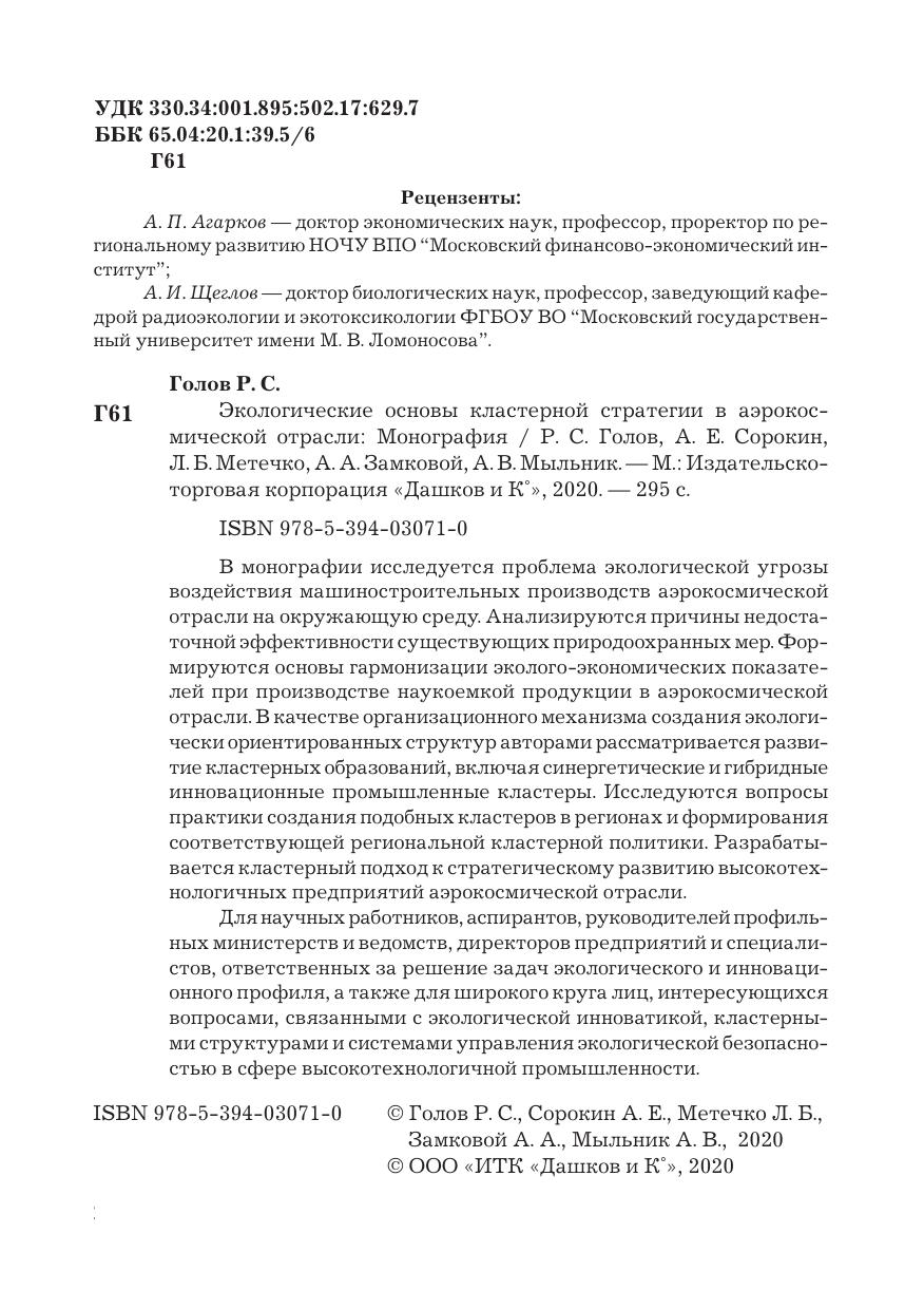 В монографии исследуется проблема экологической угрозы воздействия машиностроительных производств аэрокосмической отрасли на окружающую среду. Анализируются причины недостаточной эффективности существующих природоохранных мер. Формируются основы гармонизации эколого-экономических показателей при производстве наукоемкой продукции в аэрокосмической отрасли. В качестве организационного механизма создания экологически ориентированных структур авторами рассматривается развитие кластерных образований, включая синергетические и гибридные инновационные промышленные кластеры. Исследуются вопросы практики создания подобных кластеров в регионах и формирования соответствующей региональной кластерной политики. Разрабатывается кластерный подход к стратегическому развитию высокотехнологичных предприятий аэрокосмической отрасли.