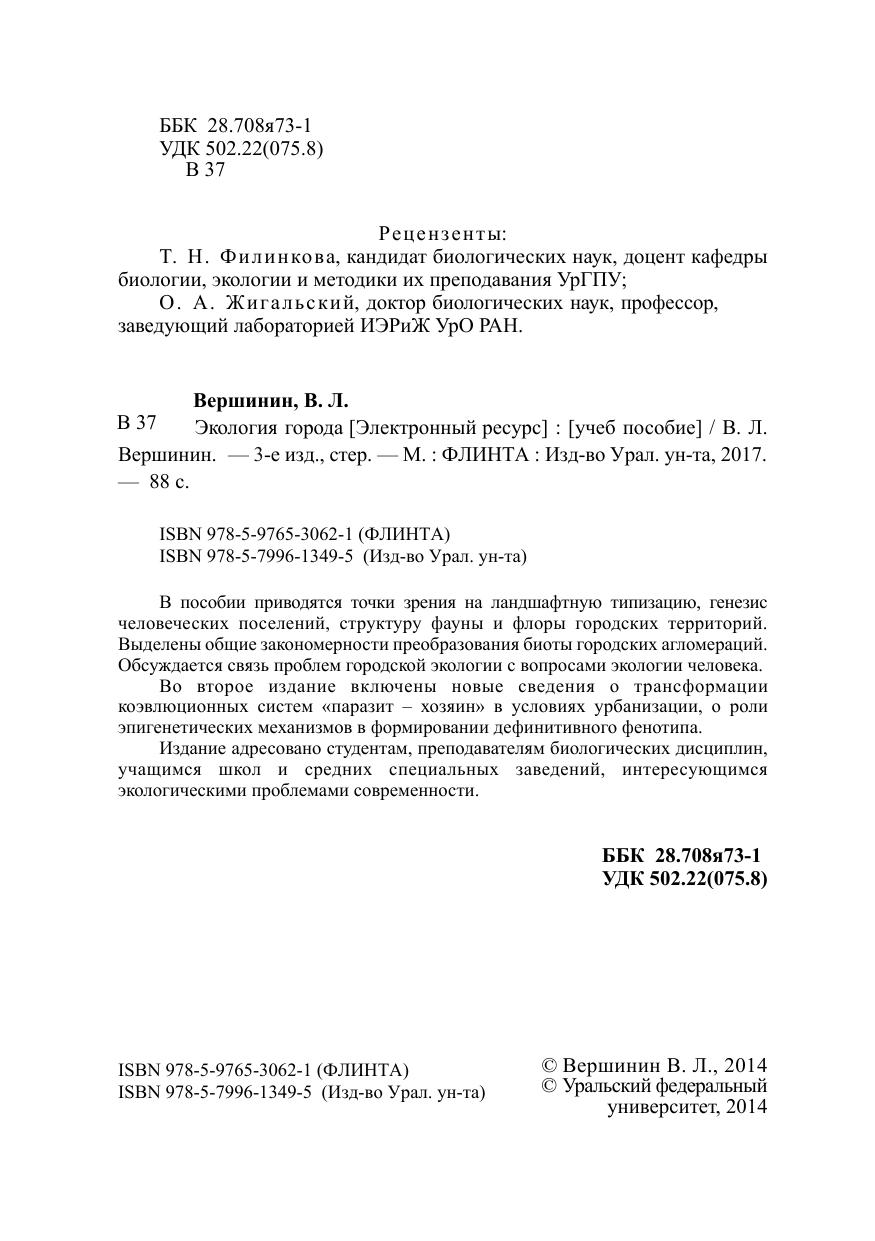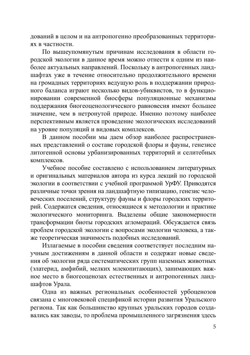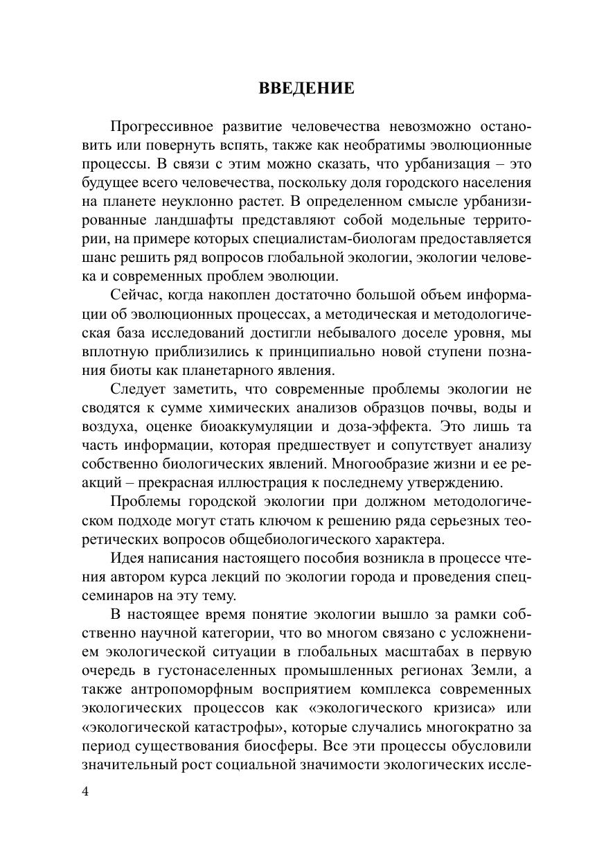 В пособии приводятся точки зрения на ландшафтную типизацию, генезис человеческих поселений, структуру фауны и флоры городских территорий. Выделены общие закономерности преобразования биоты городских агломераций. Обсуждается связь проблем городской экологии с вопросами экологии человека. Во второе издание включены новые сведения о трансформации коэвлюционных систем «паразит – хозяин» в условиях урбанизации, о роли эпигенетических механизмов в формировании дефинитивного фенотипа. Издание адресовано студентам, преподавателям биологических дисциплин, учащимся школ и средних специальных заведений, интересующимся экологическими проблемами современности.