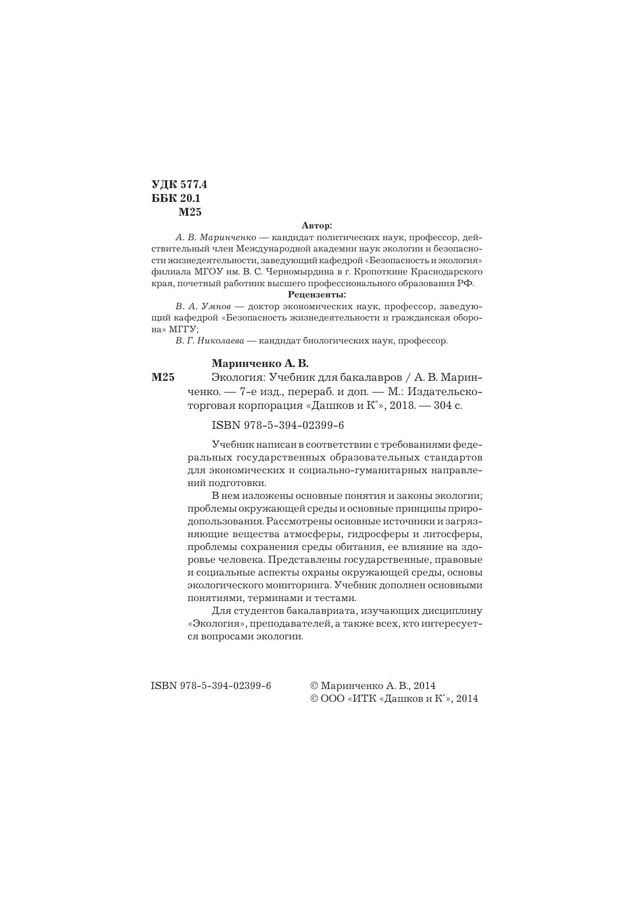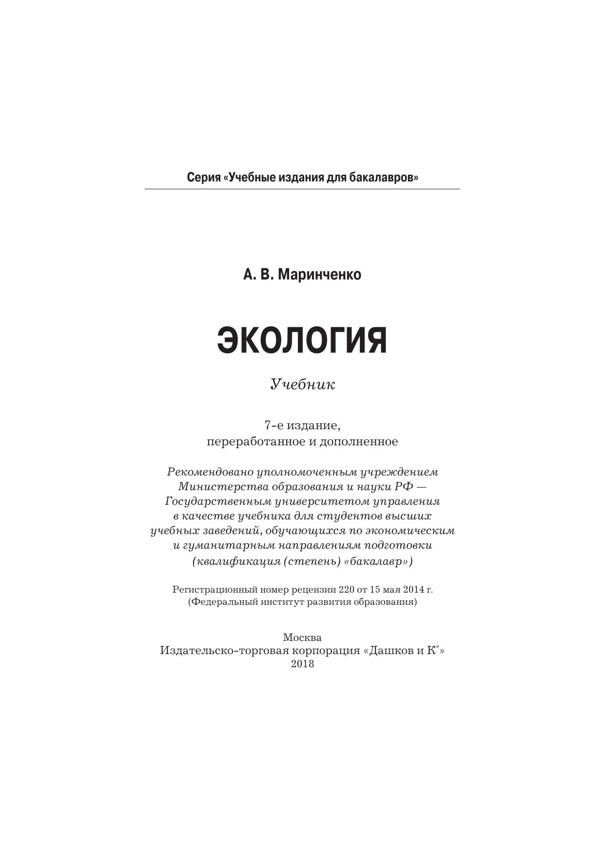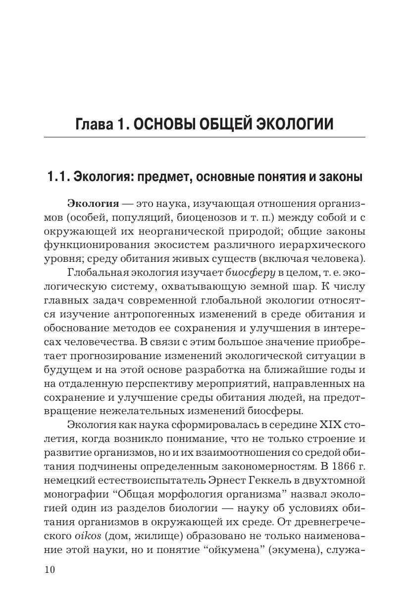 Учебник написан в соответствии с требованиями федеральных государственных образовательных стандартов для экономических и социально-гуманитарных направлений подготовки. В нем изложены основные понятия и законы экологии; проблемы окружающей среды и основные принципы природопользования. Рассмотрены основные источники и загрязняющие вещества атмосферы, гидросферы и литосферы, проблемы сохранения среды обитания, ее влияние на здоровье человека. Представлены государственные, правовые и социальные аспекты охраны окружающей среды, основы экологического мониторинга. Учебник дополнен основными понятиями, терминами и тестами. Для студентов бакалавриата, изучающих дисциплину «Экология», преподавателей, а также всех, кто интересуется вопросами экологии.