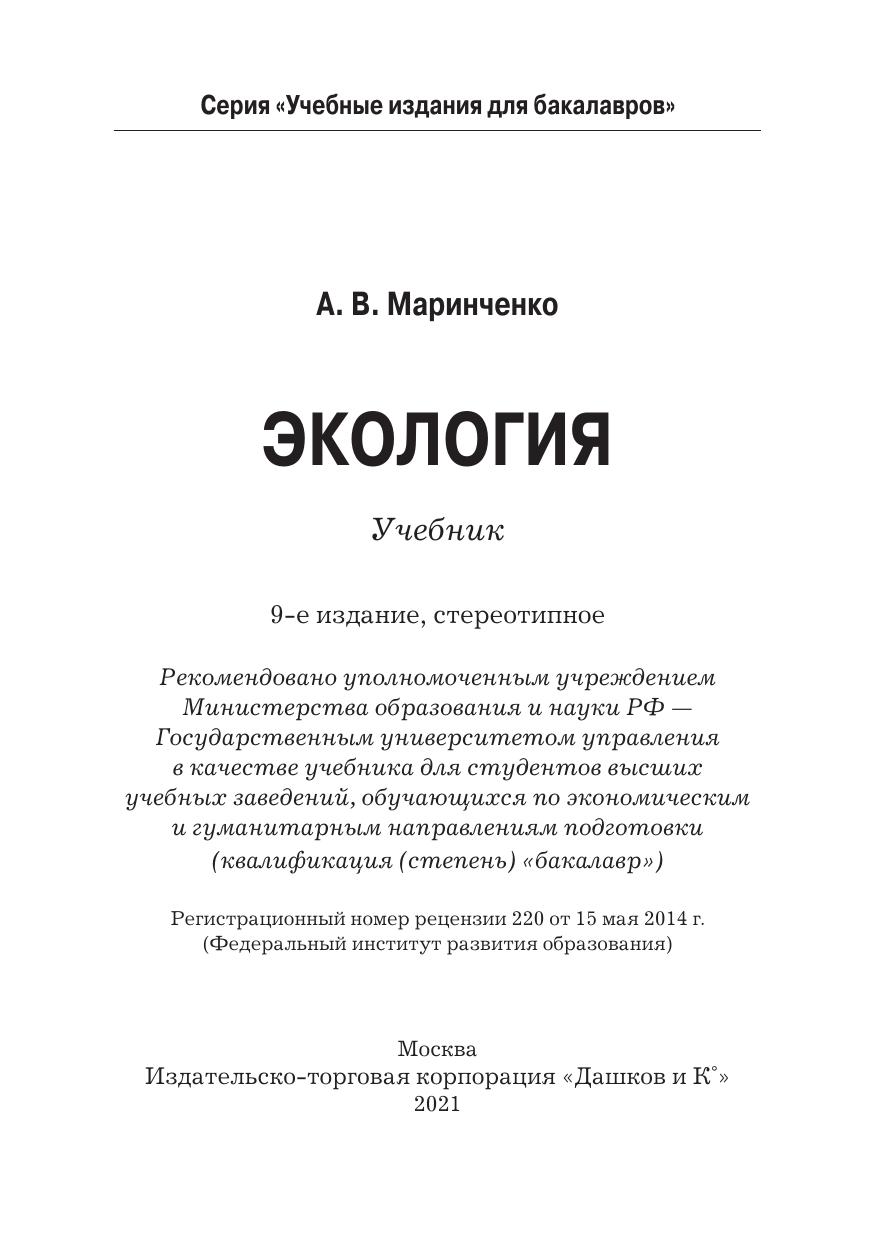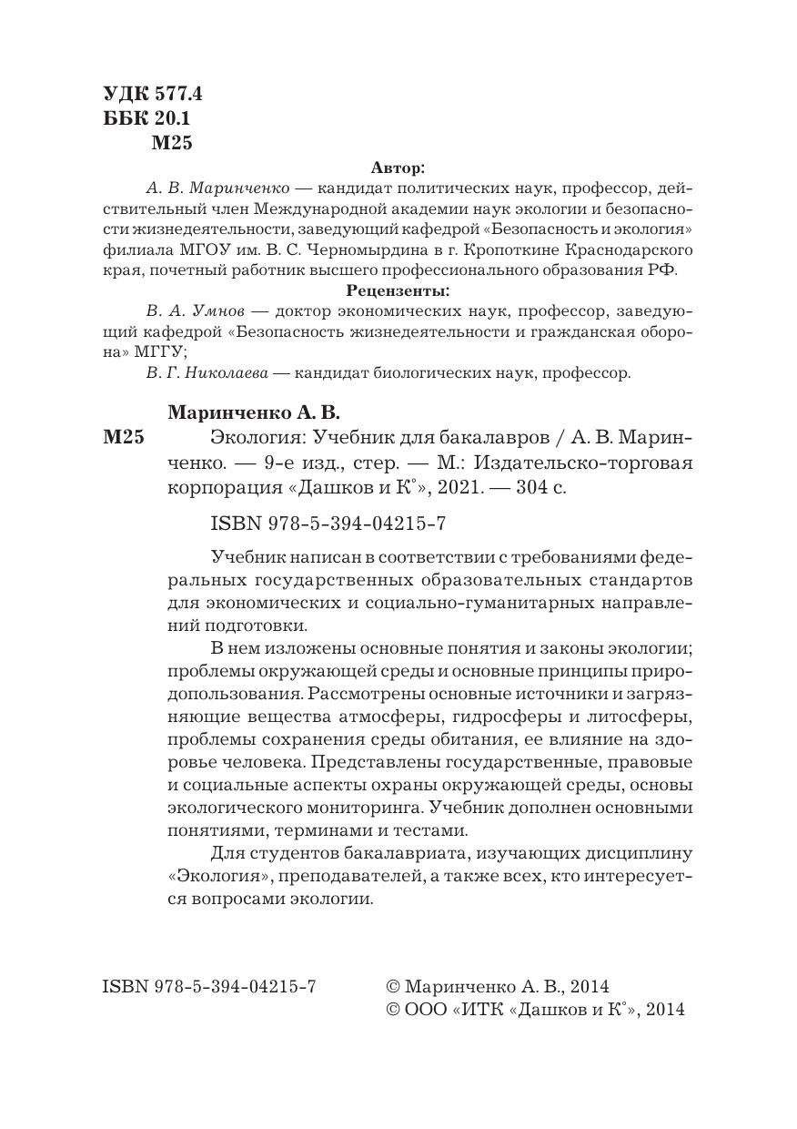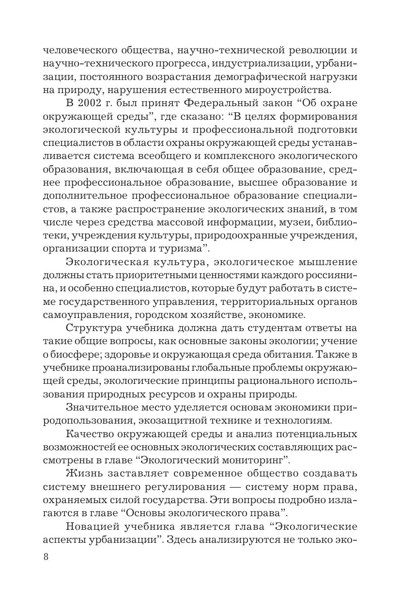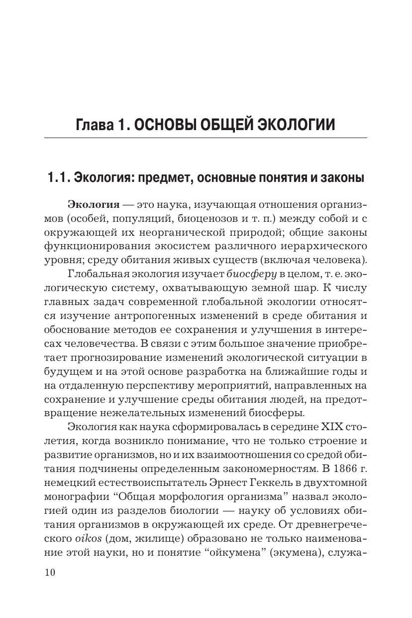 Учебник написан в соответствии с требованиями федеральных государственных образовательных стандартов для экономических и социально-гуманитарных направлений подготовки. В нем изложены основные понятия и законы экологии, проблемы окружающей среды и основные принципы природопользования. Рассмотрены основные источники и загрязняющие вещества атмосферы, гидросферы и литосферы, проблемы сохранения среды обитания, ее влияние на здоровье человека. Представлены государственные, правовые и социальные аспекты охраны окружающей среды, основы экологического мониторинга. Учебник дополнен основными понятиями, терминами и тестами. Для студентов бакалавриата, изучающих дисциплину «Экология», преподавателей, а также всех, кто интересуется вопросами экологии.