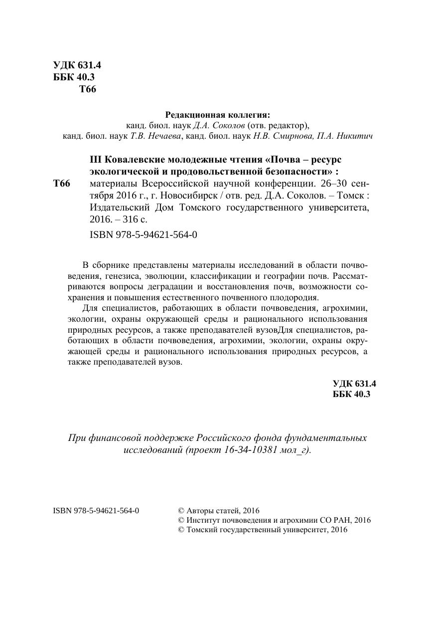 В сборнике представлены материалы исследований в области почвоведения, генезиса, эволюции, классификации и географии почв. Рассматриваются вопросы деградации и восстановления почв, возможности сохранения и повышения естественного почвенного плодородия. Для специалистов, работающих в области почвоведения, агрохимии, экологии, охраны окружающей среды и рационального использования природных ресурсов, а также преподавателей вузовДля специалистов, работающих в области почвоведения, агрохимии, экологии, охраны окружающей среды и рационального использования природных ресурсов, а также преподавателей вузов.