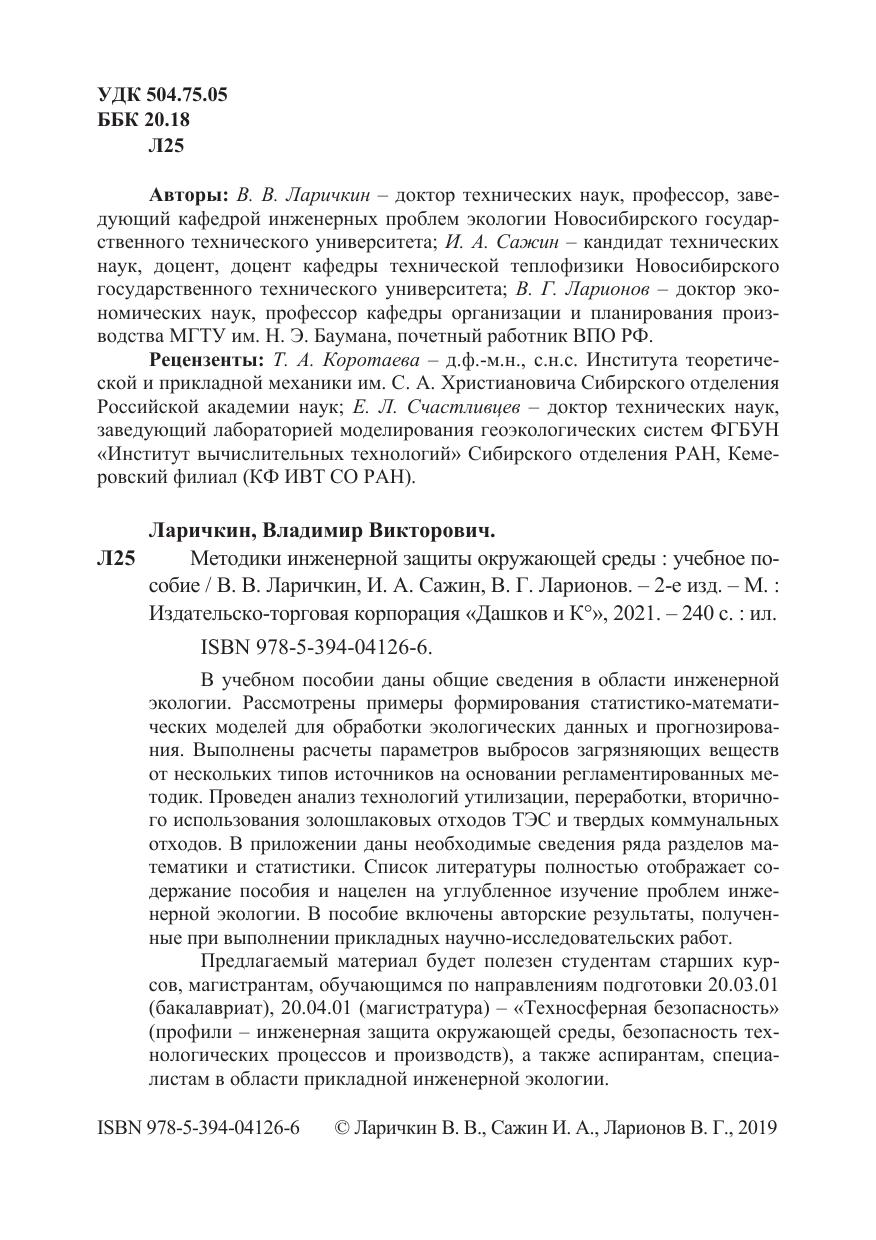 Предлагаемый материал будет полезен студентам старших курсов, магистрантам, обучающимся по направлениям подготовки 20.03.01 (бакалавриат), 20.04.01 (магистратура) – «Техносферная безопасность» (профили – инженерная защита окружающей среды, безопасность технологических процессов и производств), а также аспирантам, специалистам в области прикладной инженерной экологии.