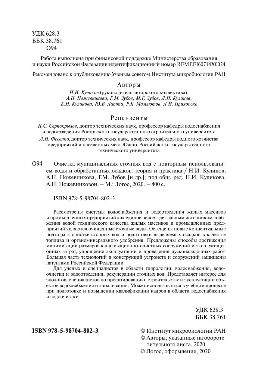 Очистка муниципальных сточных вод c повторным использованием воды и обработанных осадков: теория и практика