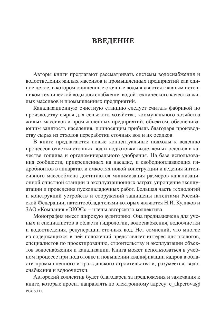 Рассмотрены системы водоснабжения и водоотведения жилых массивов и промышленных предприятий как единое целое, где главным источником снабжения водой технического качества жилых массивов и промышленных предприятий являются очищенные сточные воды. Освещены новые концептуальные подходы к очистке сточных вод и подготовки выделяемых осадков в качестве топлива и органоминерального удобрения. Предложены способы достижения минимизации размеров канализационно-очистных сооружений и эксплуатационных затрат, упрощение эксплуатации и проведения пусконаладочных работ. Большая часть технологий и конструкций устройств и сооружений защищены патентами Российской Федерации. Для ученых и специалистов в области гидрологии, водоснабжения, водоочистки и водоотведения, рекуперации сточных вод. Представляет интерес для экологов, специалистов по проектированию, строительству и эксплуатации объектов водоснабжения и канализации. Может использоваться в учебном процессе при подготовке и повышении квалификации кадров в области водоснабжения и водоочистки.