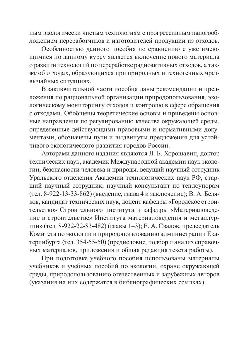 В учебном пособии приведена классификация отходов, показаны их объемы, определены основные направления переработки. Рассмотрены различные аспекты переработки промышленных отходов: источники их образования, особенности отходов горнорудных предприятий, безотходные технологии, обращение с токсичными промышленными отходами, технологии переработки радиоактивных отходов, образование отходов при чрезвычайных ситуациях, области применения продукции из промышленных отходов. Адресовано студентам, изучающим дисциплину «Экология городской среды».