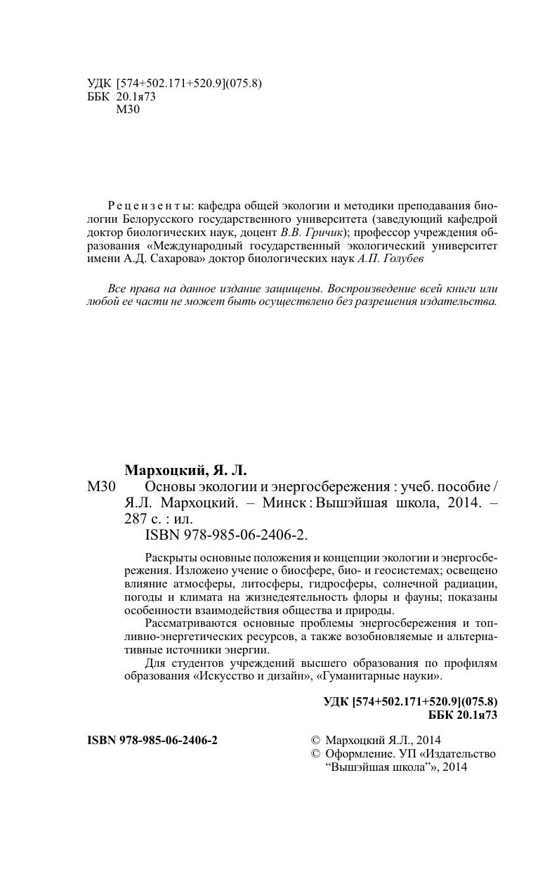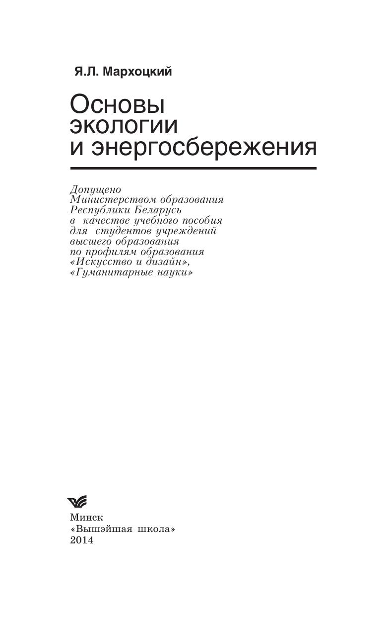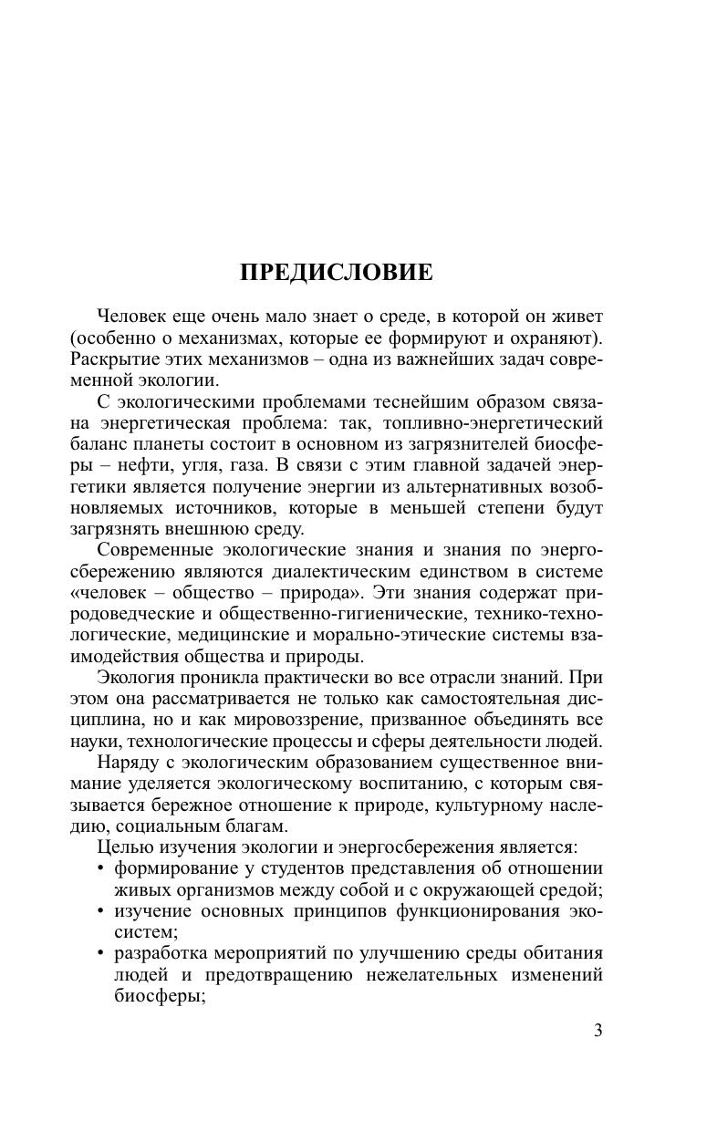 Раскрыты основные положения и концепции экологии и энергосбережения. Изложено учение о биосфере, экологических факторах, экологии популяций, био- и геосистемах. Освещено влияние атмосферы, литосферы, гидросферы, солнечной радиации, погоды и климата на жизнедеятельность флоры и фауны. Показаны особенности взаимодействия общества и природы. Рассматриваются основные проблемы энергосбережения и топливно-энергетических ресурсов, а также возобновляемые и альтернативные источники энергии. Для студентов вузов по профилям образования "Искусство и дизайн", "Гуманитарные науки".