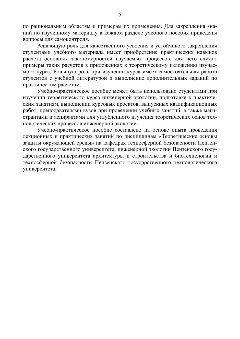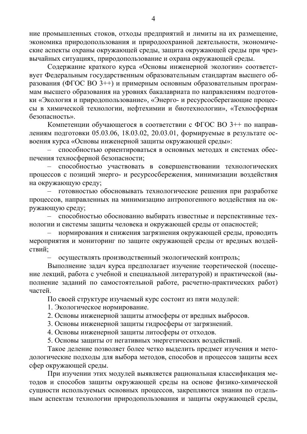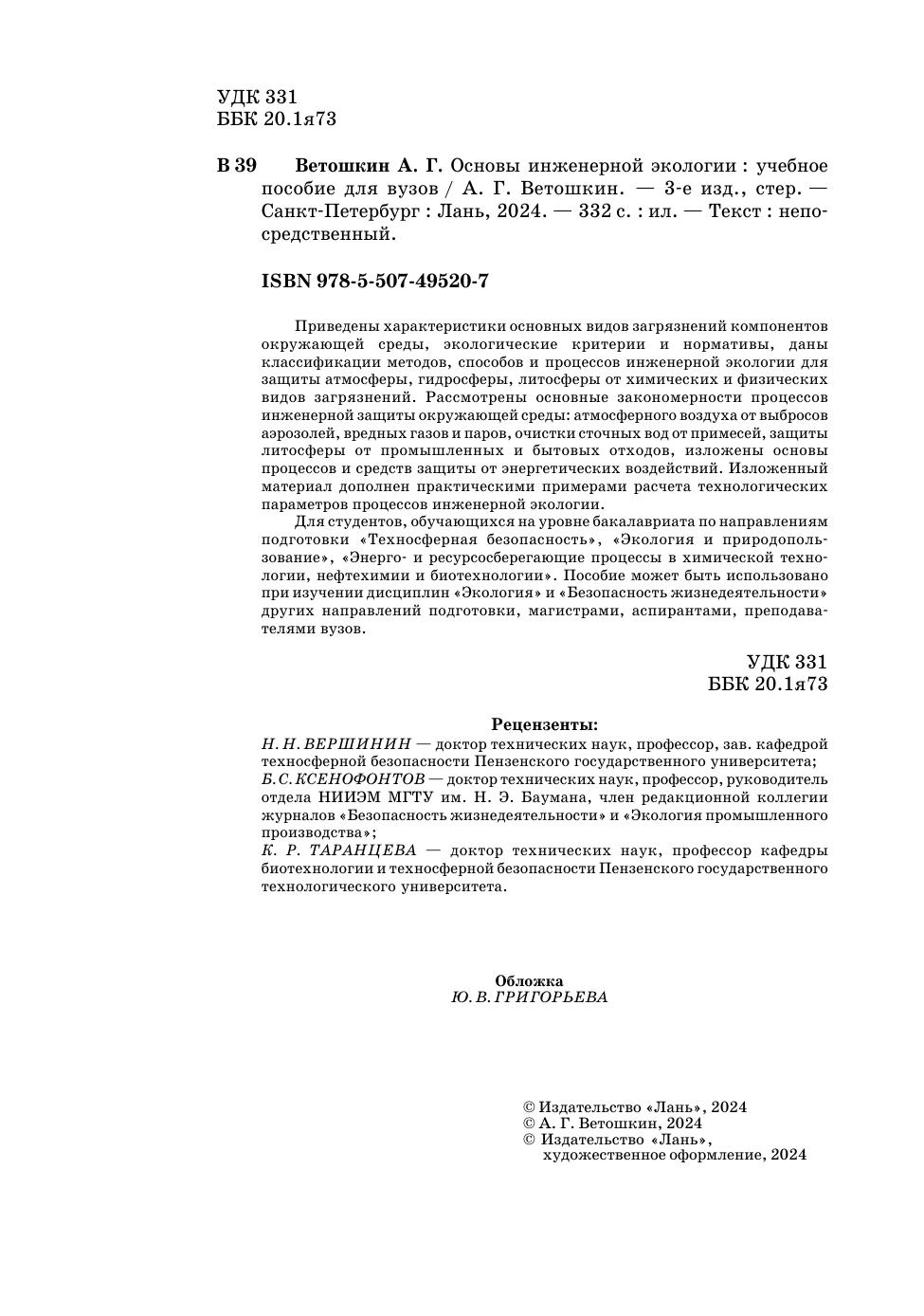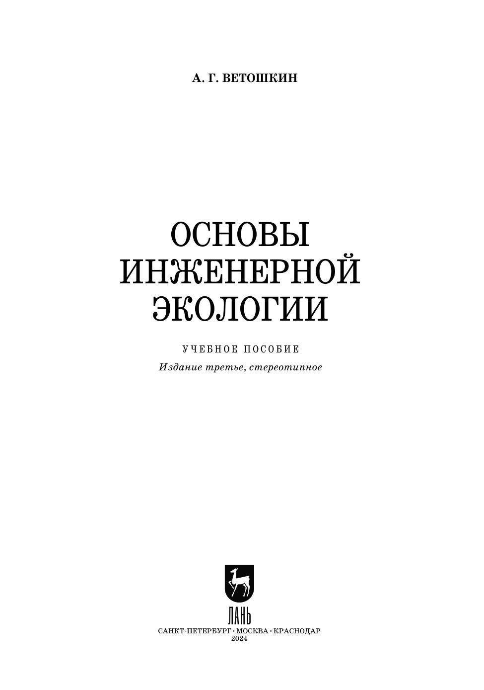 Приведены характеристики основных видов загрязнений компонентов окружающей среды, экологические критерии и нормативы, даны классификации методов, способов и процессов инженерной экологии для защиты атмосферы, гидросферы, литосферы от химических и физических видов загрязнений. Рассмотрены основные закономерности процессов инженерной защиты окружающей среды: атмосферного воздуха от выбросов аэрозолей, вредных газов и паров, очистки сточных вод от примесей, защиты литосферы от промышленных и бытовых отходов, изложены основы процессов и средств защиты от энергетических воздействий. Изложенный материал дополнен практическими примерами расчета технологических параметров процессов инженерной экологии. Для студентов, обучающихся на уровне бакалавриата по направлениям подготовки «Техносферная безопасность», «Экология и природопользование», «Энерго- и ресурсосберегающие процессы в химической технологии, нефтехимии и биотехнологии». Пособие может быть использовано при изучении дисциплин «Экология» и «Безопасность жизнедеятельности» других направлений подготовки, магистрами, аспирантами, преподавателями вузов.