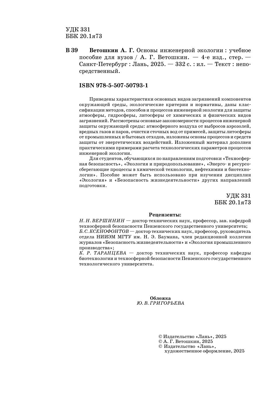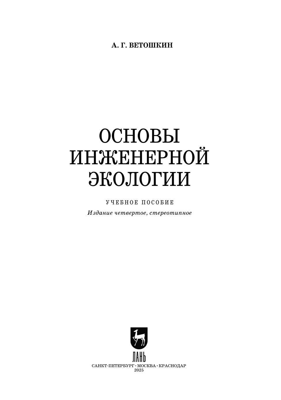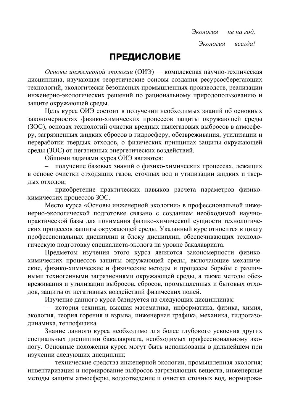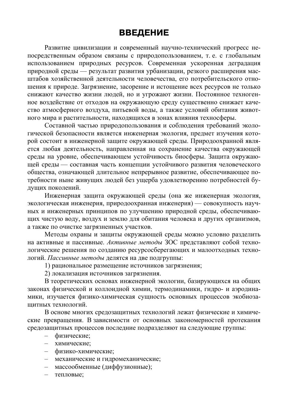 Приведены характеристики основных видов загрязнений компонентов окружающей среды, экологические критерии и нормативы, даны классификации методов, способов и процессов инженерной экологии для защиты атмосферы, гидросферы, литосферы от химических и физических видов загрязнений. Рассмотрены основные закономерности процессов инженерной защиты окружающей среды: атмосферного воздуха от выбросов аэрозолей, вредных газов и паров, очистки сточных вод от примесей, защиты литосферы от промышленных и бытовых отходов, изложены основы процессов и средств защиты от энергетических воздействий. Изложенный материал дополнен практическими примерами расчета технологических параметров процессов инженерной экологии. Для студентов, обучающихся по направлениям подготовки «Техносферная безопасность», «Экология и природопользование», «Энерго- и ресурсосберегающие процессы в химической технологии, нефтехимии и биотехнологии». Пособие может быть использовано при изучении дисциплин «Экология» и «Безопасность жизнедеятельности» других направлений подготовки.
