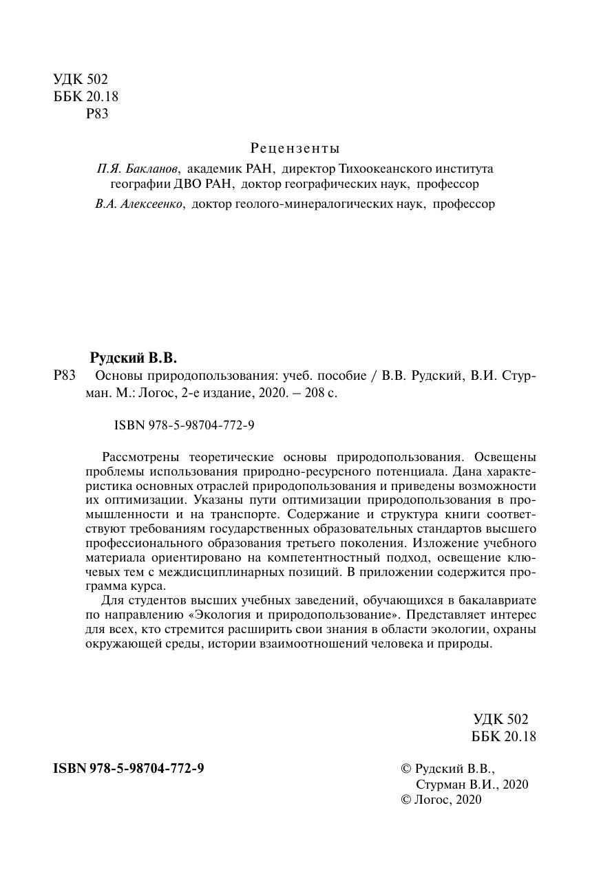 Рассмотрены теоретические основы природопользования. Освещены проблемы использования природно-ресурсного потенциала. Дана характеристика основных отраслей природопользования и приведены возможности их оптимизации. Указаны пути оптимизации природопользования в промышленности и на транспорте. Содержание и структура книги соответствуют требованиям государственных образовательных стандартов высшего профессионального образования третьего поколения. Изложение учебного материала ориентировано на компетентностный подход, освещение ключевых тем с междисциплинарных позиций. В приложении содержится программа курса. Для студентов высших учебных заведений, обучающихся в бакалавриате по направлению «Экология и природопользование». Представляет интерес для всех, кто стремится расширить свои знания в области экологии, охраны окружающей среды, истории взаимоотношений человека и природы.
