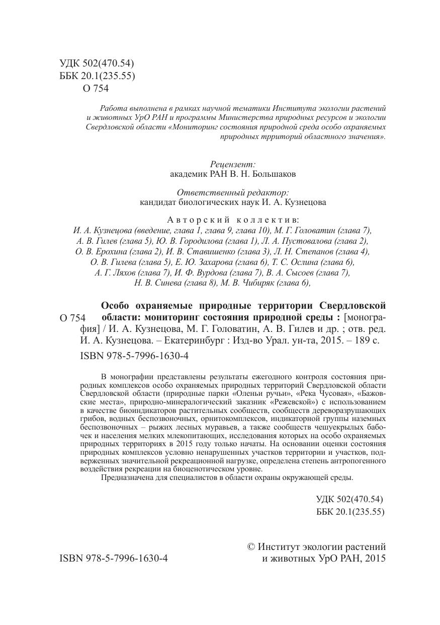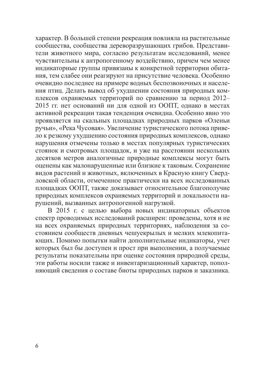 В монографии представлены результаты ежегодного контроля состояния природных комплексов особо охраняемых природных территорий Свердловской области Свердловской области (природные парки «Оленьи ручьи», «Река Чусовая», «Бажовские места», природно-минералогический заказник «Режевской») с использованием в качестве биоиндикаторов растительных сообществ, сообществ дереворазрушающих грибов, водных беспозвоночных, орнитокомплексов, индикаторной группы наземных беспозвоночных – рыжих лесных муравьев, а также сообществ чешуекрылых бабочек и населения мелких млекопитающих, исследования которых на особо охраняемых природных территориях в 2015 году только начаты. На основании оценки состояния природных комплексов условно ненарушенных участков территории и участков, подверженных значительной рекреационной нагрузке, определена степень антропогенного воздействия рекреации на биоценотическом уровне. Предназначена для специалистов в области охраны окружающей среды.