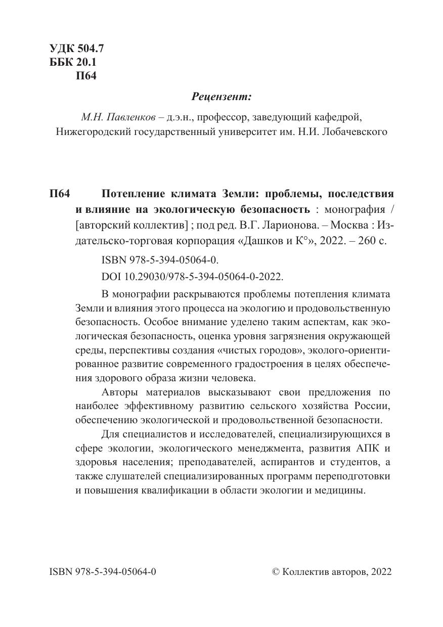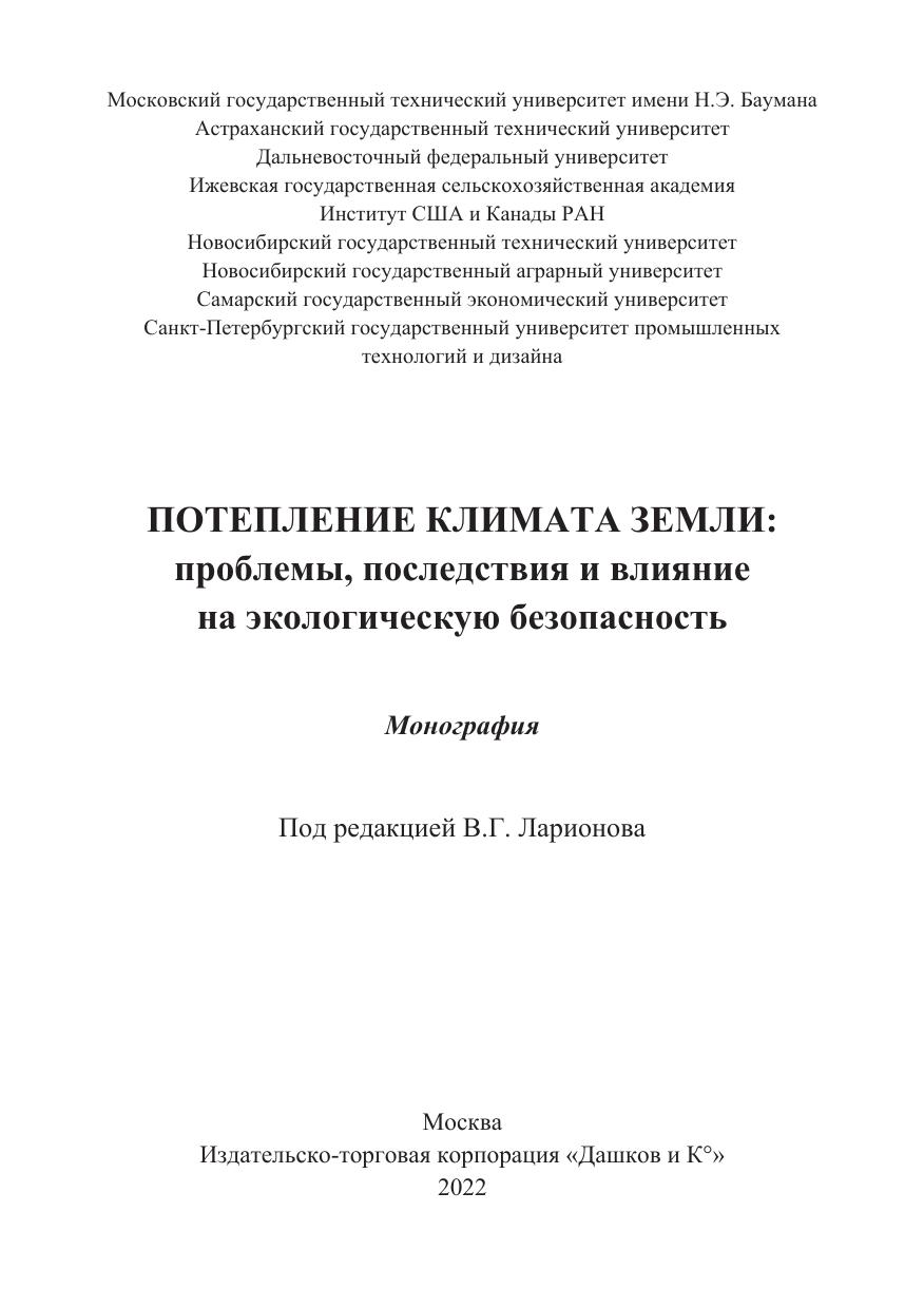 В монографии раскрываются проблемы потепления климата Земли и влияния этого процесса на экологию и продовольственную безопасность. Особое внимание уделено таким аспектам, как экологическая безопасность, оценка уровня загрязнения окружающей среды, перспективы создания «чистых городов», эколого-ориентированное развитие современного градостроения в целях обеспечения здорового образа жизни человека.