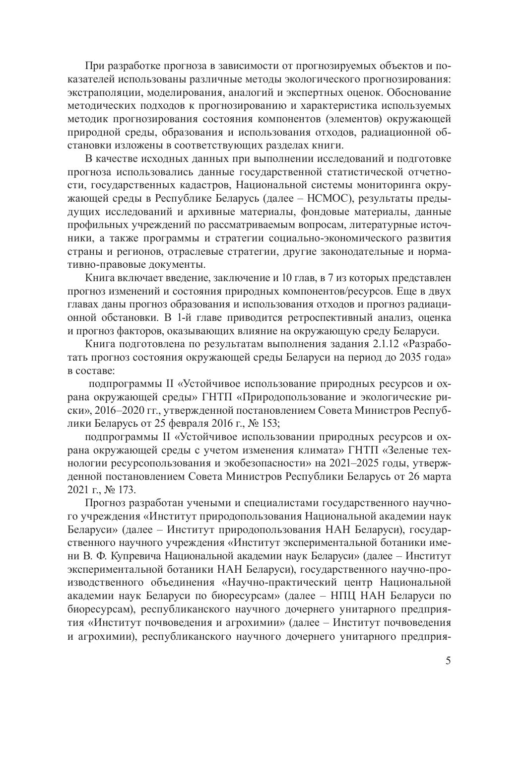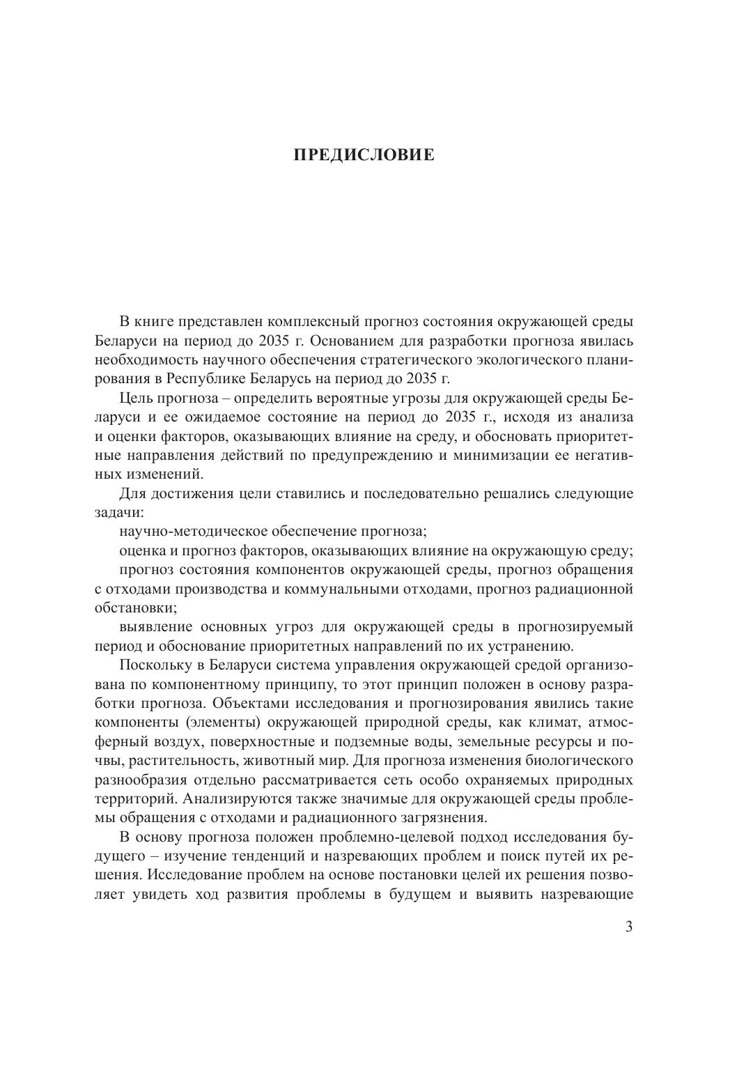 В книге представлен комплексный прогноз изменения и состояния природной среды Беларуси на период до 2035 г., включающий прогнозы изменений климата, состояния атмосферного воздуха, поверхностных и подземных вод, земельных ресурсов и почв, растительного и животного мира, биологического разнообразия, а также значимых для окружающей среды проблем обращения с отходами и радиационного загрязнения. Рассматриваются методические аспекты прогноза, приводятся ретроспективный анализ, оценка и прогноз факторов, оказывающих влияние на природную среду Беларуси. Анализируются основные угрозы в экологической сфере в прогнозируемый период, обосновываются приоритетные направления действий