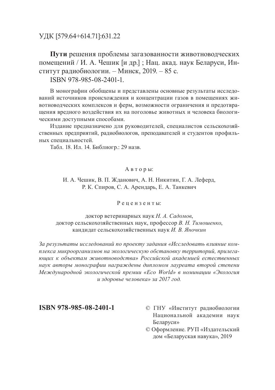 В монографии обобщены и представлены основные результаты исследований источников происхождения и концентрации газов в помещениях животноводческих комплексов и ферм, возможности ограничения и предотвращения вредного воздействия их на поголовье животных и человека биологическими доступными способами. Издание предназначено для руководителей, специалистов сельскохозяйственных предприятий, радиобиологов, преподавателей и студентов профильных специальностей.