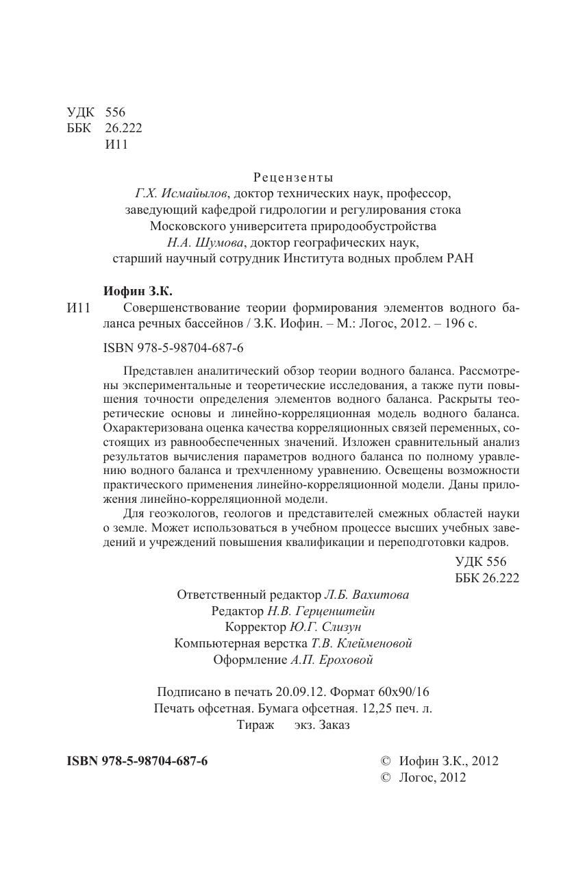 Представлен аналитический обзор теории водного баланса. Рассмотрены экспериментальные и теоретические исследования, а также пути повышения точности определения элементов водного баланса. Раскрыты теоретические основы и линейно-корреляционная модель водного баланса. Охарактеризована оценка качества корреляционных связей переменных, состоящих из равнообеспеченных значений. Изложен сравнительный анализ результатов вычисления параметров водного баланса по полному уравлению водного баланса и трехчленному уравнению. Освещены возможности практического применения линейно-корреляционной модели. Даны приложения линейно-корреляционной модели. Для геоэкологов, геологов и представителей смежных областей науки о земле. Может использоваться в учебном процессе высших учебных заведений и учреждений повышения квалификации и переподготовки кадров.