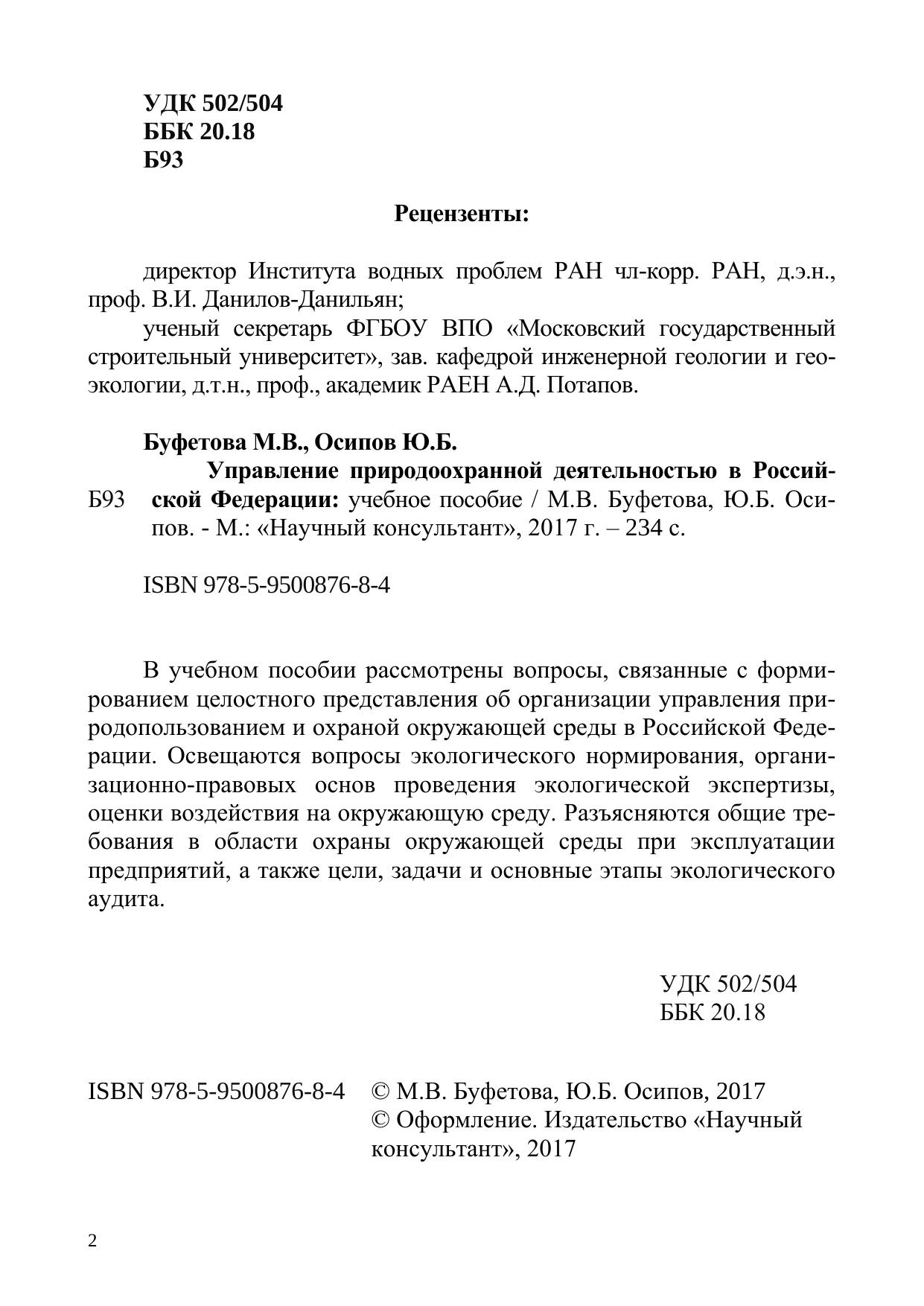 В учебном пособии рассмотрены вопросы, связанные с формированием целостного представления об организации управления природопользованием и охраной окружающей среды в Российской Федерации. Освещаются вопросы экологического нормирования, организационно-правовых основ проведения экологической экспертизы, оценки воздействия на окружающую среду. Разъясняются общие требования в области охраны окружающей среды при эксплуатации предприятий, а также цели, задачи и основные этапы экологического аудита.