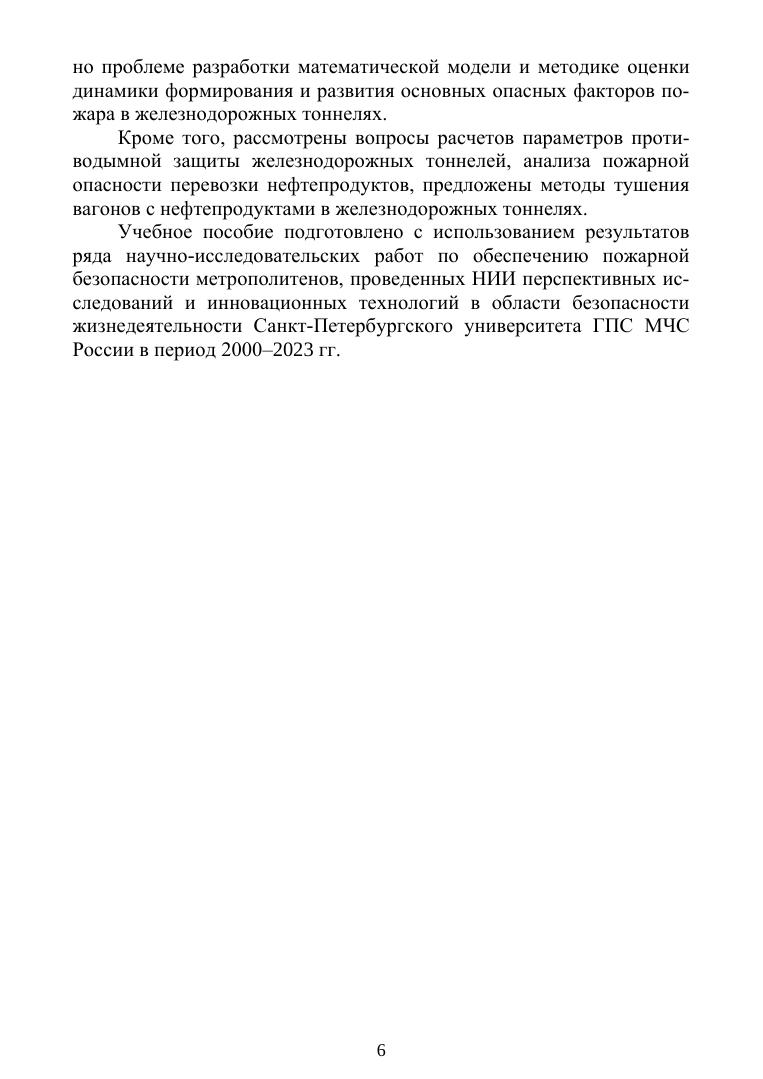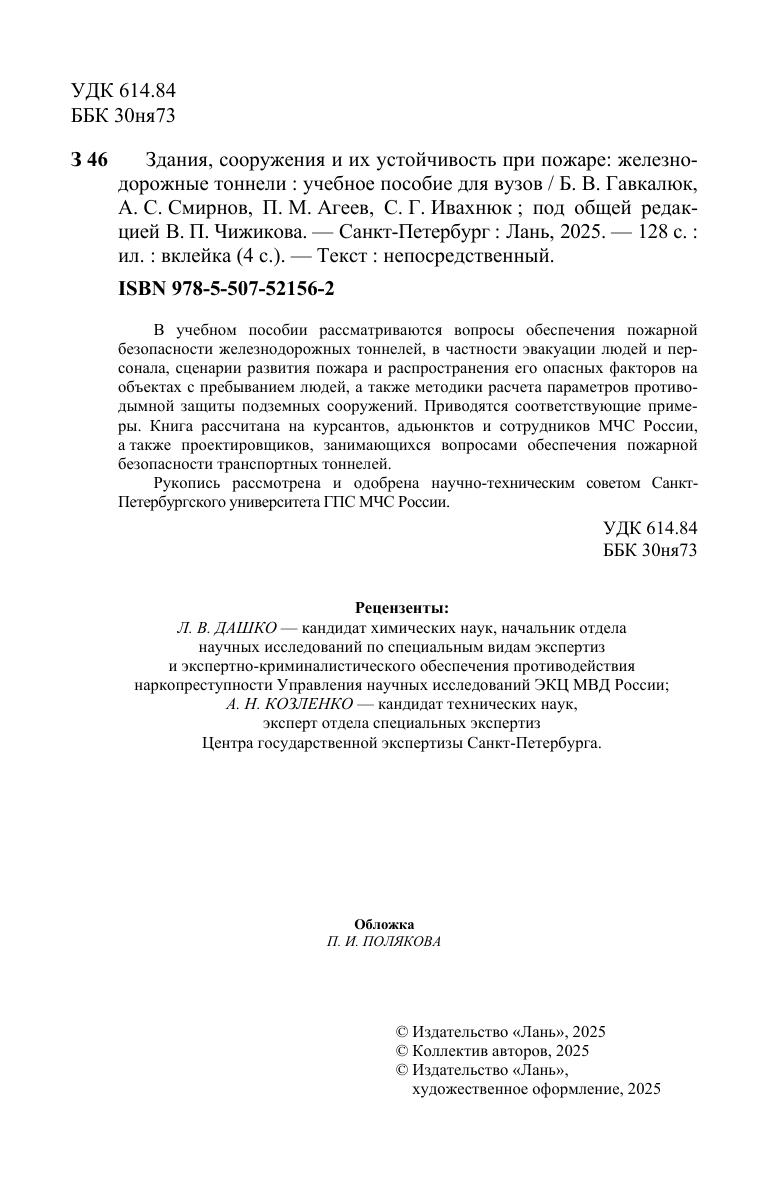 В учебном пособии рассматриваются вопросы обеспечения пожарной безопасности железнодорожных тоннелей, в частности эвакуации людей и персонала, сценарии развития пожара и распространения его опасных факторов на объектах с пребыванием людей, а также методики расчета параметров противодымной защиты подземных сооружений. Приводятся соответствующие примеры. Книга рассчитана на курсантов, адьюнктов и сотрудников МЧС России, а также проектировщиков, занимающихся вопросами обеспечения пожарной безопасности транспортных тоннелей. Рукопись рассмотрена и одобрена научно-техническим советом Санкт-Петербургского университета ГПС МЧС России.