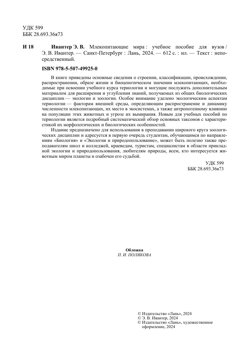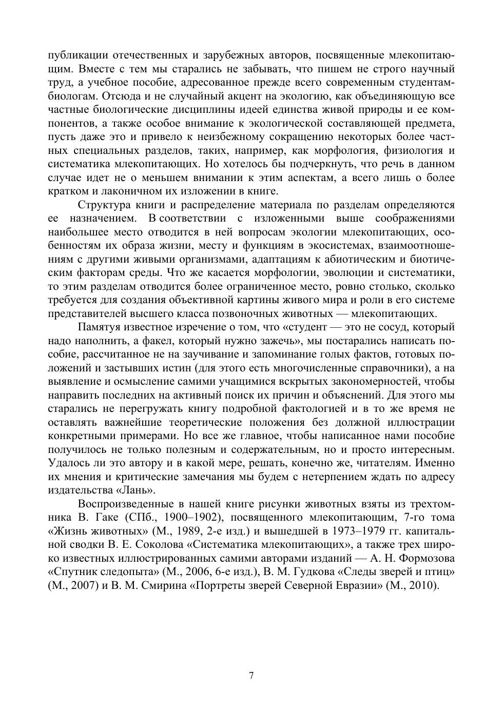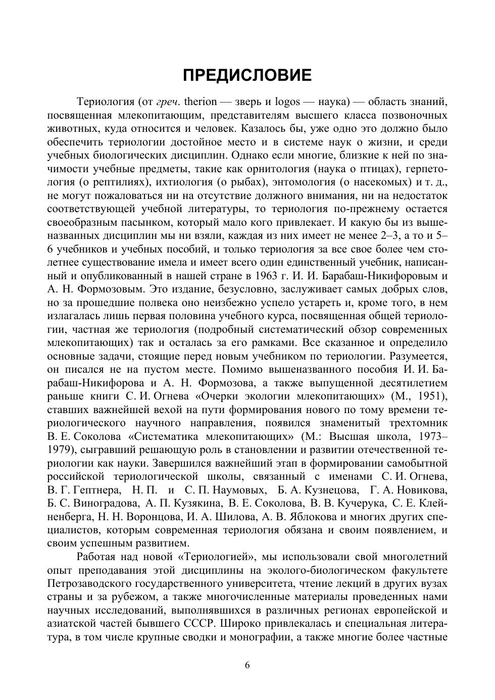 В книге приведены основные сведения о строении, классификации, происхождении, распространении, образе жизни и биоценотическом значении млекопитающих, необходимые при освоении учебного курса териологии и могущие послужить дополнительным материалом для расширения и углубления знаний, получаемых из общих биологических дисциплин — экологии и зоологии. Особое внимание уделено экологическим аспектам териологии — факторам внешней среды, определяющим распространение и динамику численности млекопитающих, их место в экосистемах, а также антропогенному влиянию на популяции этих животных и угрозе их вымирания. Новым для учебных пособий по териологии является подробный систематический обзор основных таксонов с характеристикой их морфологических и биологических особенностей. Издание предназначено для использования в преподавании широкого круга зоологических дисциплин и адресуется в первую очередь студентам, обучающимся по направлениям «Биология» и «Экология и природопользование», может быть полезно также преподавателям школ и колледжей, краеведам, туристам, специалистам в области прикладной экологии и природопользования, любителям природы, всем, кто интересуется животным миром планеты и озабочен его судьбой.
