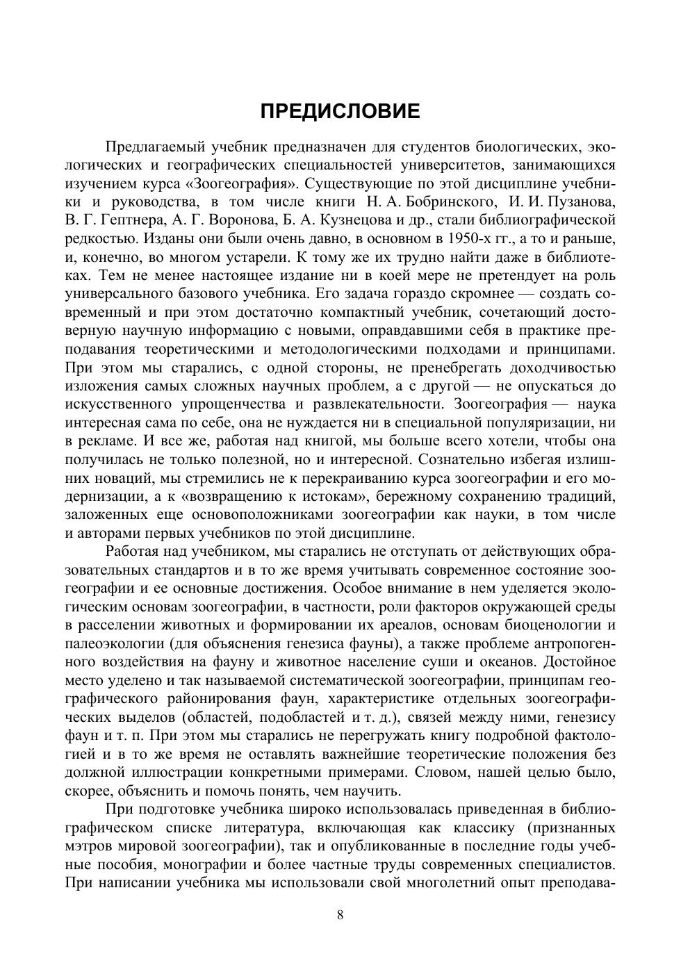 В учебнике в компактной форме излагаются основные положения современной зоогеографии, рассматриваются ее главные принципы, экологические и исторические аспекты. Особое внимание уделено экологической зоогеографии — роли факторов среды и условий прошлых эпох в расселении животных и формировании их ареалов. Освещается также проблема антропогенного воздействия на фауну и животное население суши и океанов. Подробно анализируются фаунистические комплексы основных зоогеографических областей. Учебник предназначен для студентов университетов, обучающихся по направлениям «Биология», «Экология и природопользование» и «География, но может быть полезен также преподавателям школ и техникумов, краеведам, туристам, специалистам в области прикладной экологии, науке о земле и природопользования, самому широкому кругу любителей природы.