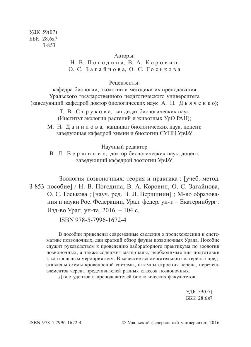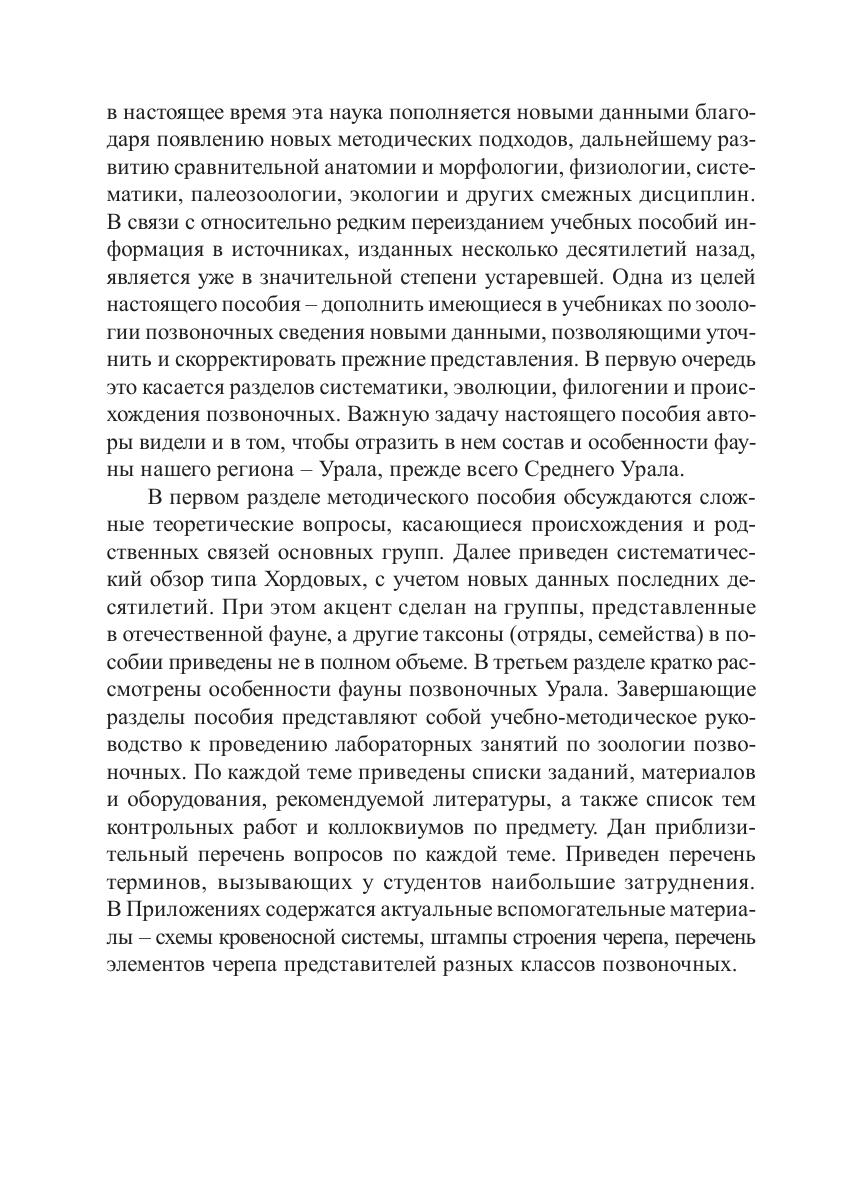В пособии приведены современные сведения о происхождении и систематике позвоночных, дан краткий обзор фауны позвоночных Урала. Пособие служит руководством к проведению лабораторного практикума по зоологии позвоночных, а также содержит материалы, необходимые для подготовки к контрольным мероприятиям. В качестве вспомогательного материала представлены схемы кровеносной системы, штампы строения черепа, перечень элементов черепа представителей разных классов позвоночных. Для студентов и преподавателей биологических факультетов.