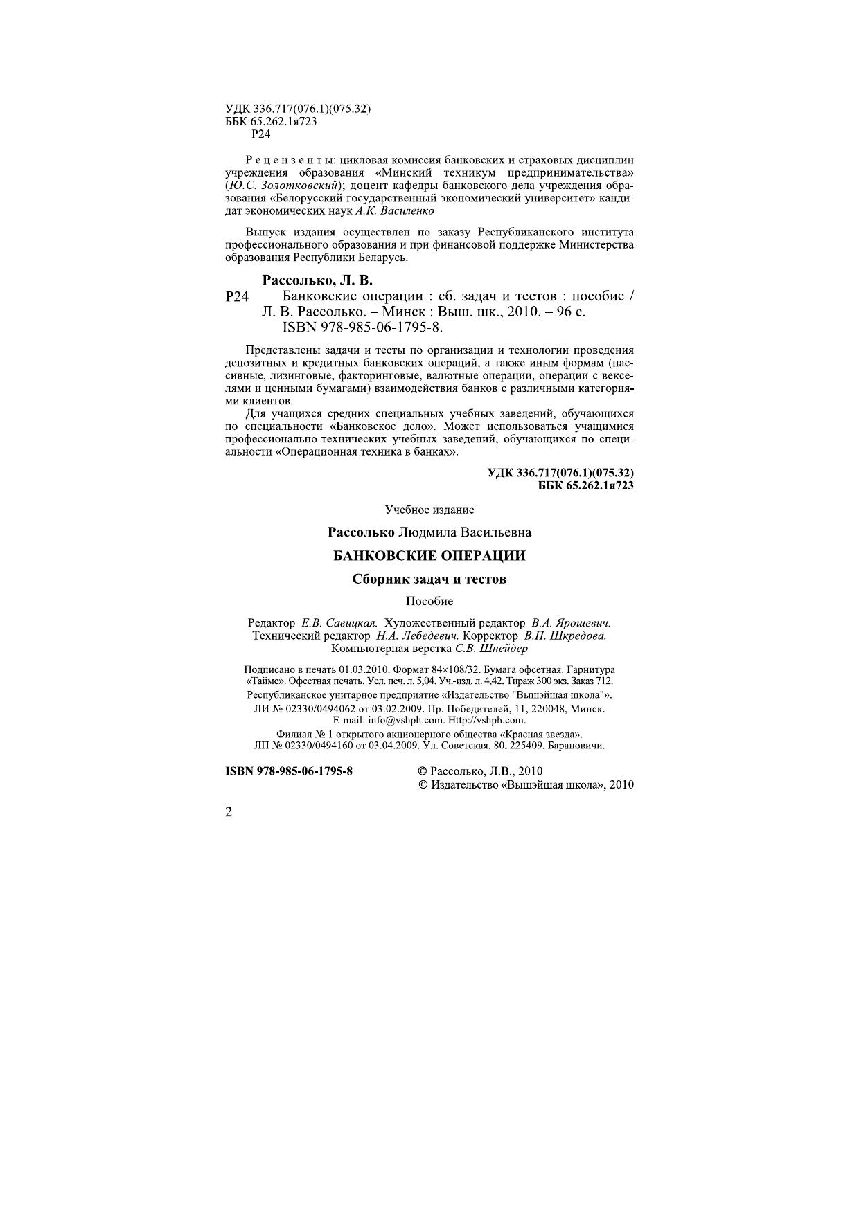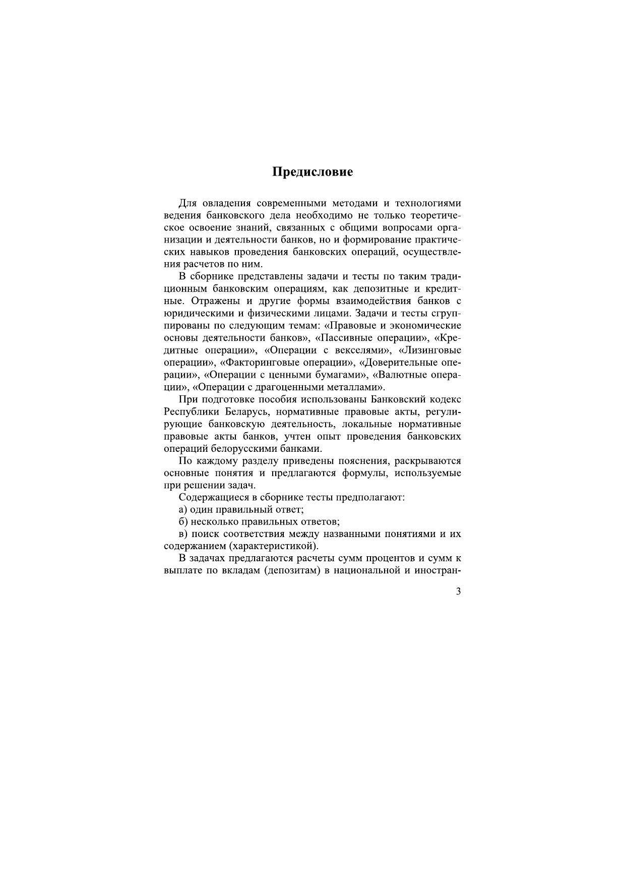 Представлены задачи и тесты по организации и технологии проведения депозитных и кредитных банковских операций, а также иным формам (пассивные, лизинговые, факторинговые, валютные операции, операции с векселями и ценными бумагами) взаимодействия банков с различными категориями клиентов. Для учащихся средних специальных учебных заведений, обучающихся по специальности "Банковское дело". Может использоваться в учреждениях, обеспечивающих получение профессионально-технического образования по дисциплине "Операционная техника в банках".