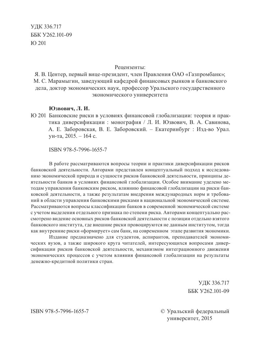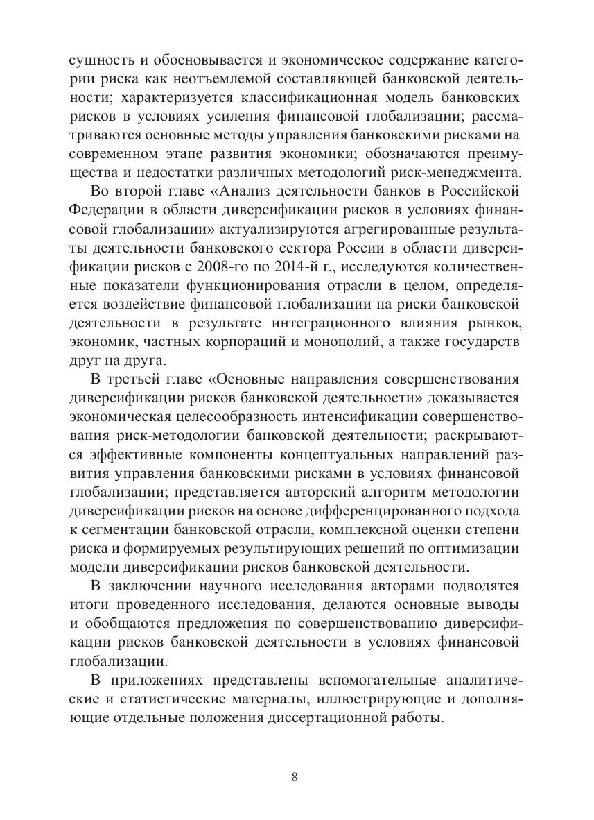 В работе рассматриваются вопросы теории и практики диверсификации рисков банковской деятельности. Авторами представлен концептуальный подход к исследованию экономической природа и сущности рисков банковской деятельности, принципы деятельности банков в условиях финансовой глобализации. Особое внимание уделено методам управления банковским риском, влиянию финансовой глобализации на риски банковской деятельности, а также результатам внедрения международных норм и требований в области управления банковскими рисками в национальной экономической системе. Рассматриваются вопросы классификации банков в современной экономической системе с учетом выделения отдельного признака по степени риска. Авторами концептуально рассмотрено видение основных рисков банковской деятельности с позиции отдельно взятого банковского института, где внешние риски провоцируются не данным институтом, тогда как внутренние риски «формирует» сам банк, на современном этапе развития экономики. Издание предназначено для студентов, аспирантов, преподавателей экономических вузов, а также широкого круга читателей, интересующихся вопросами диверсификации рисков банковской деятельности, механизмом интеграционного движения экономических процессов с учетом влияния финансовой глобализации на результаты денежно-кредитной политики стран.
