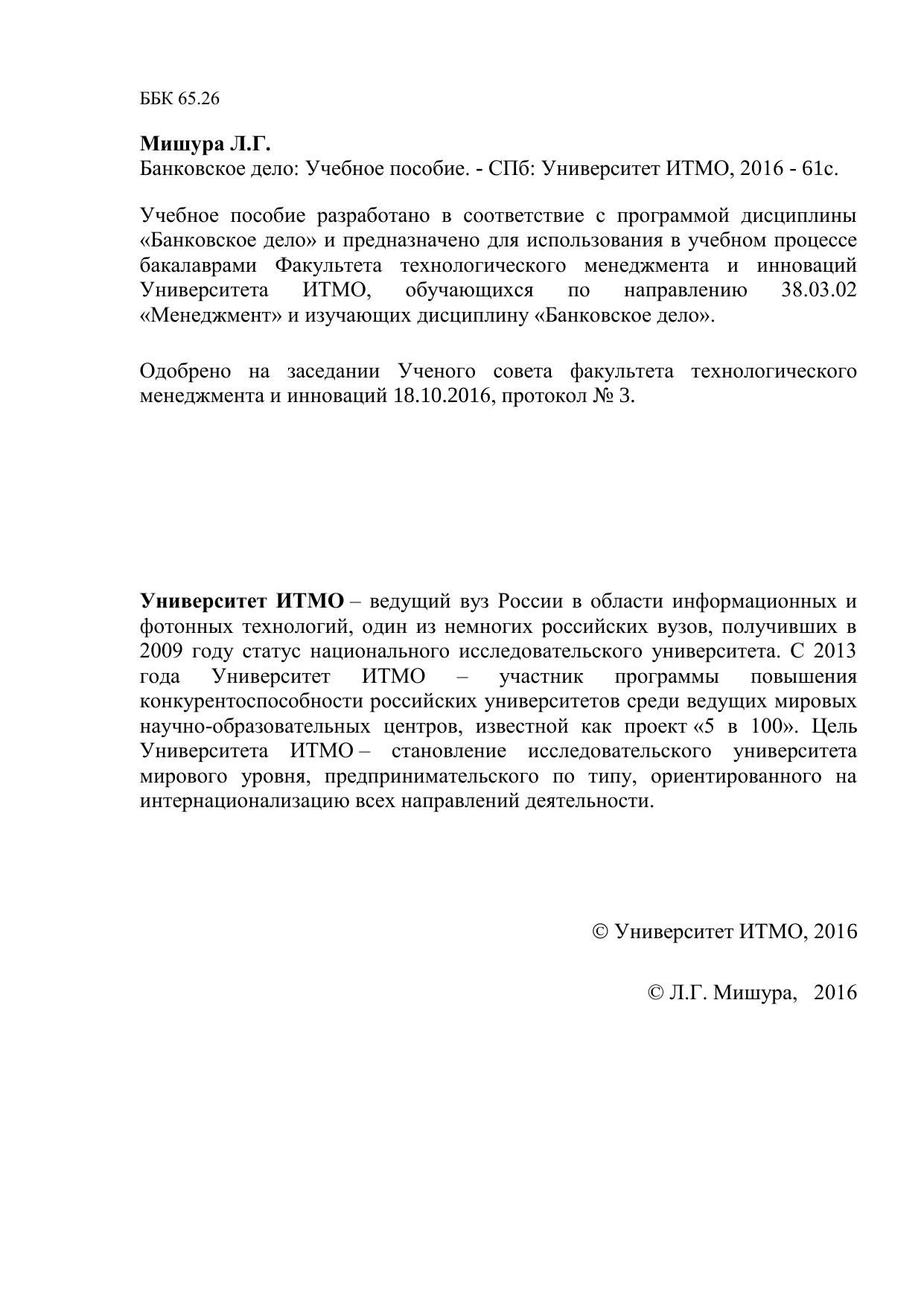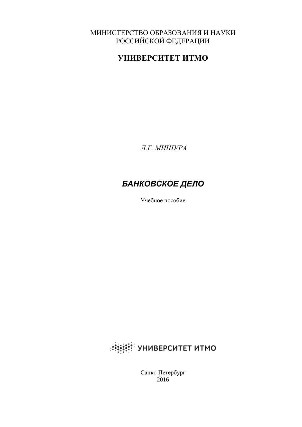 Учебное пособие разработано в соответствие с программой дисциплины «Банковское дело» и предназначено для использования в учебном процессе бакалаврами Факультета технологического менеджмента и инноваций Университета ИТМО, обучающихся по направлению 38.03.02 «Менеджмент» и изучающих дисциплину «Банковское дело».