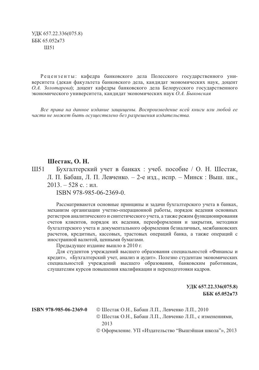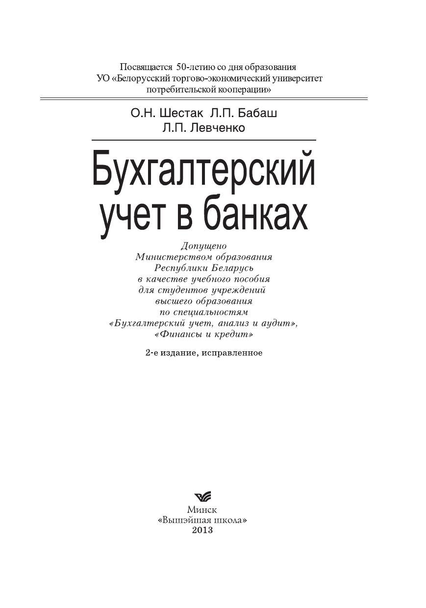 Рассматриваются принципы и задачи бухгалтерского учета в банках организация учетно-операционной работы порядок ведения основных регистров аналитического и синтетического учета режим функционирования счетов клиентов, порядок их ведения, переоформления и закрытия методики бухгалтерского учета и документального оформления безналичных межбанковских регистров, кредитных, кассовых и трастовых операций банка, а также операций с иностранной валютой, ценными бумагами. Для студентов вузов специальностей "Финансы и кредит", "Бухгалтерский учет, анализ и аудит". Будет полезно банковским работникам, слушателям курсов повышения квалификации и переподготовки кадров.