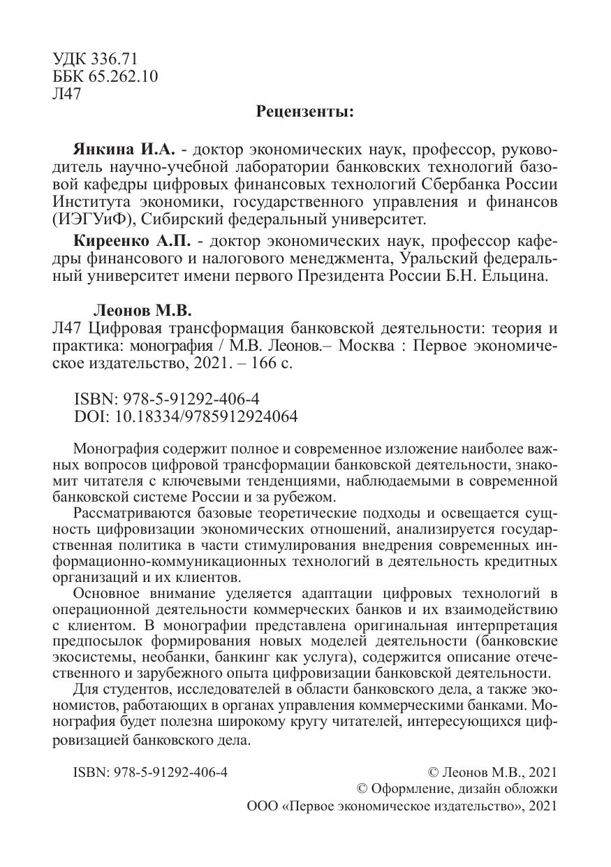 Монография содержит полное и современное изложение наиболее важных вопросов цифровой трансформации банковской деятельности, знакомит читателя с ключевыми тенденциями, наблюдаемыми в современной банковской системе России и за рубежом.