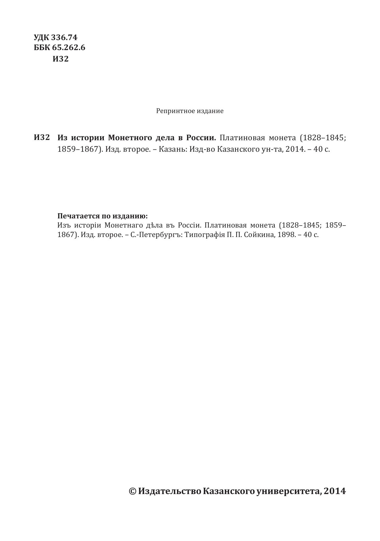 По изданию: Изъ исторiи Монетнаго д?ла въ Россiи. Платиновая монета (1828–1845; 1859– 1867). Изд. второе. – С.-Петербургъ: Типографiя П. П. Сойкина, 1898. – 40 с.