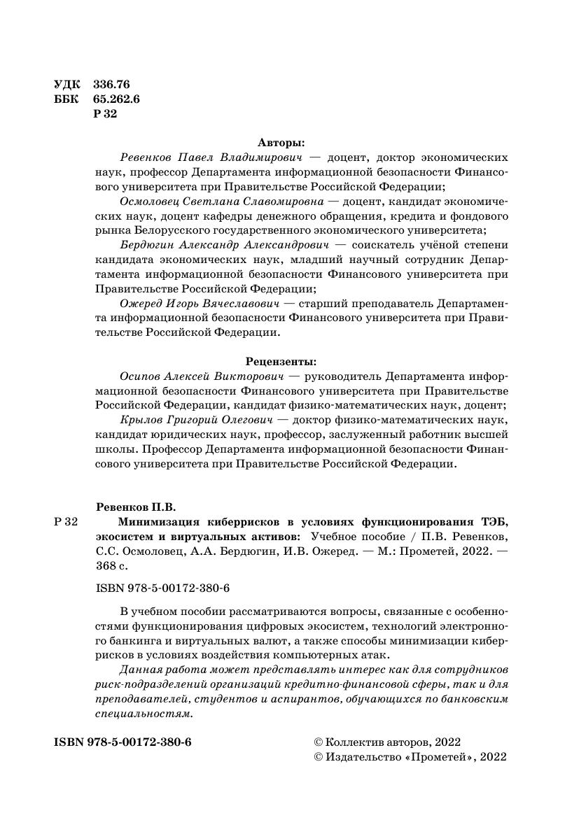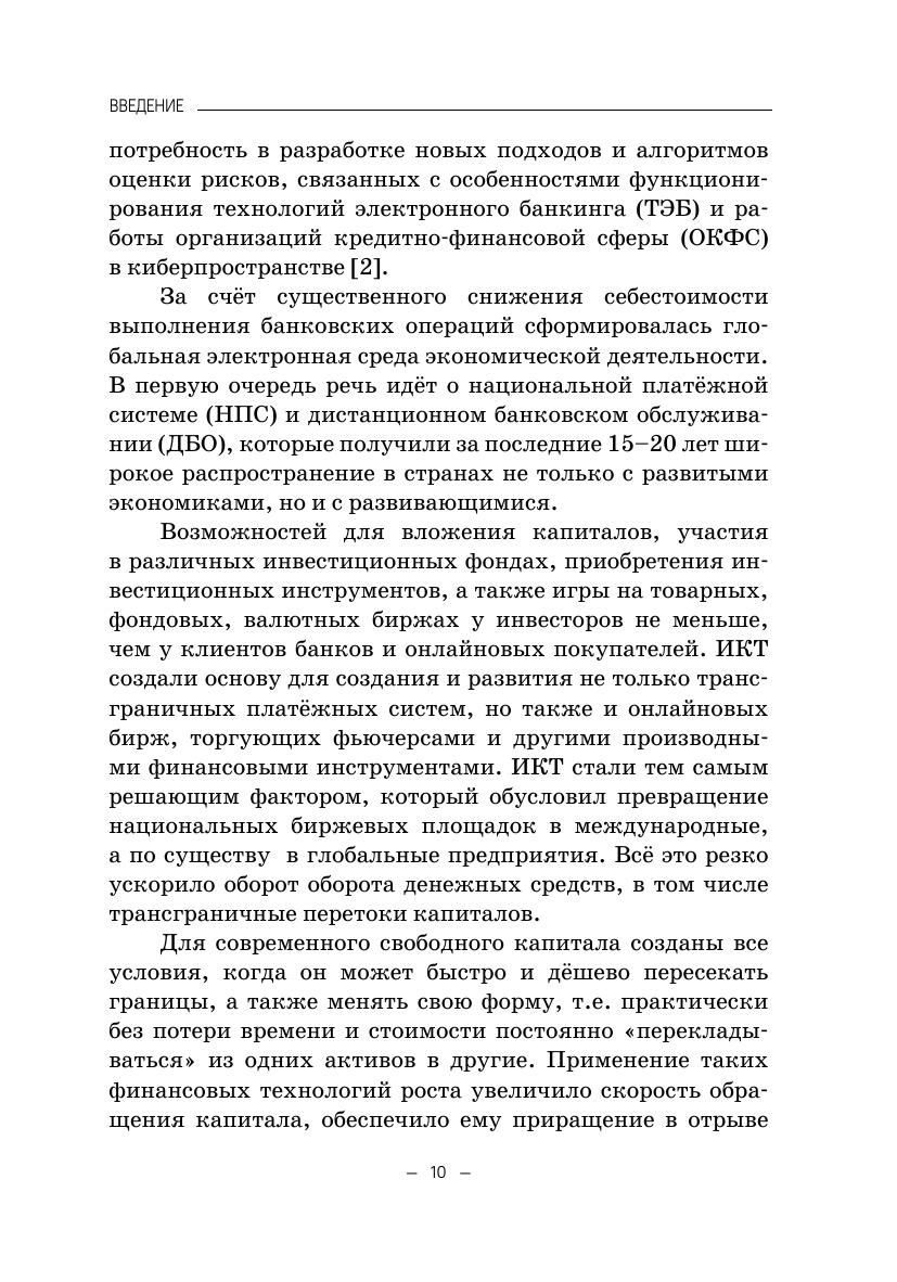В учебном пособии рассматриваются вопросы, связанные с особенностями функционирования цифровых экосистем, технологий электронного банкинга и виртуальных валют, а также способы минимизации киберрисков в условиях воздействия компьютерных атак. Данная работа может представлять интерес как для сотрудников риск подразделений организаций кредитно-финансовой сферы, так и для преподавателей, студентов и аспирантов, обучающихся по банковским специальностям.