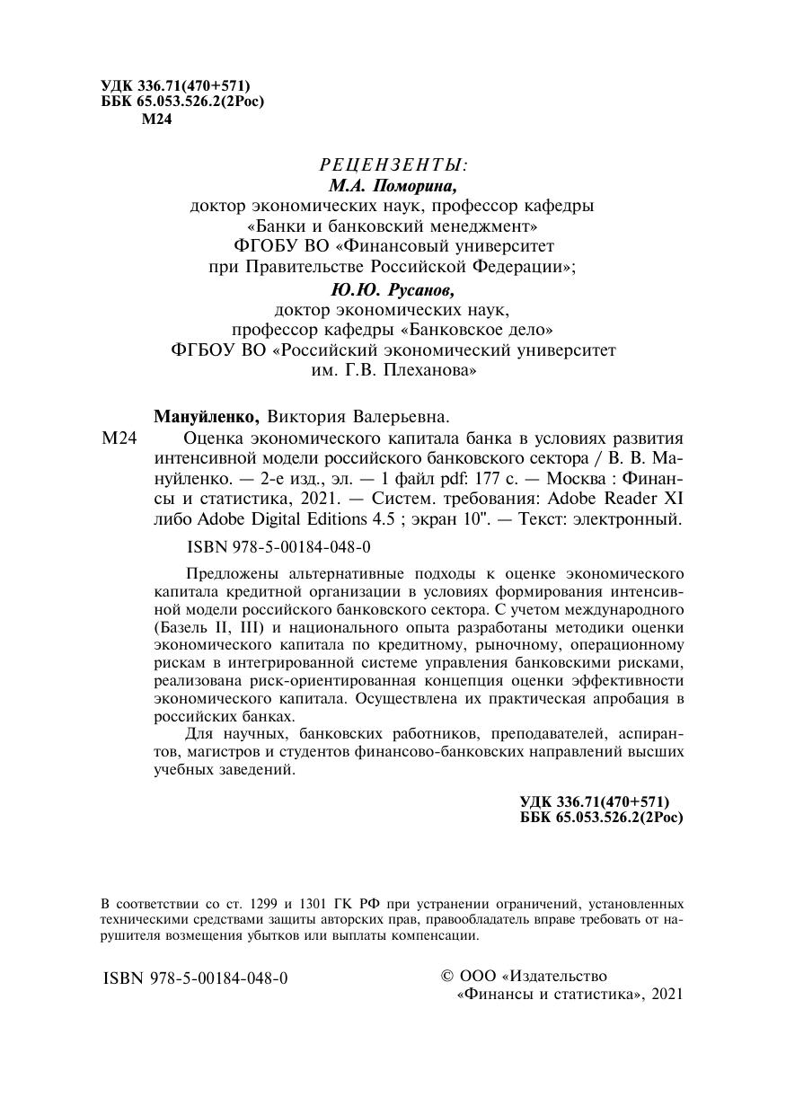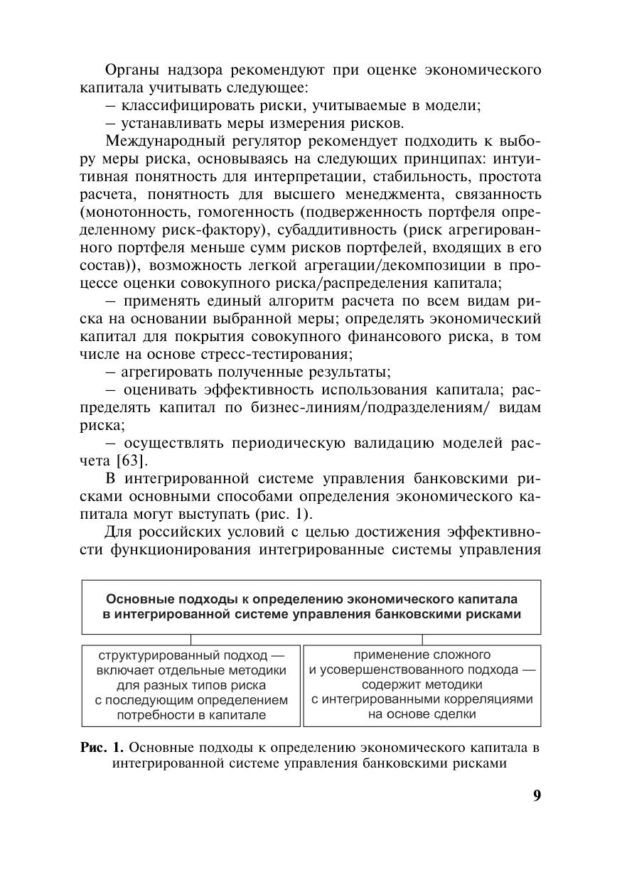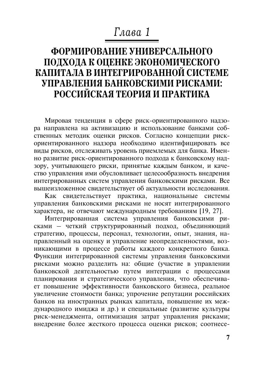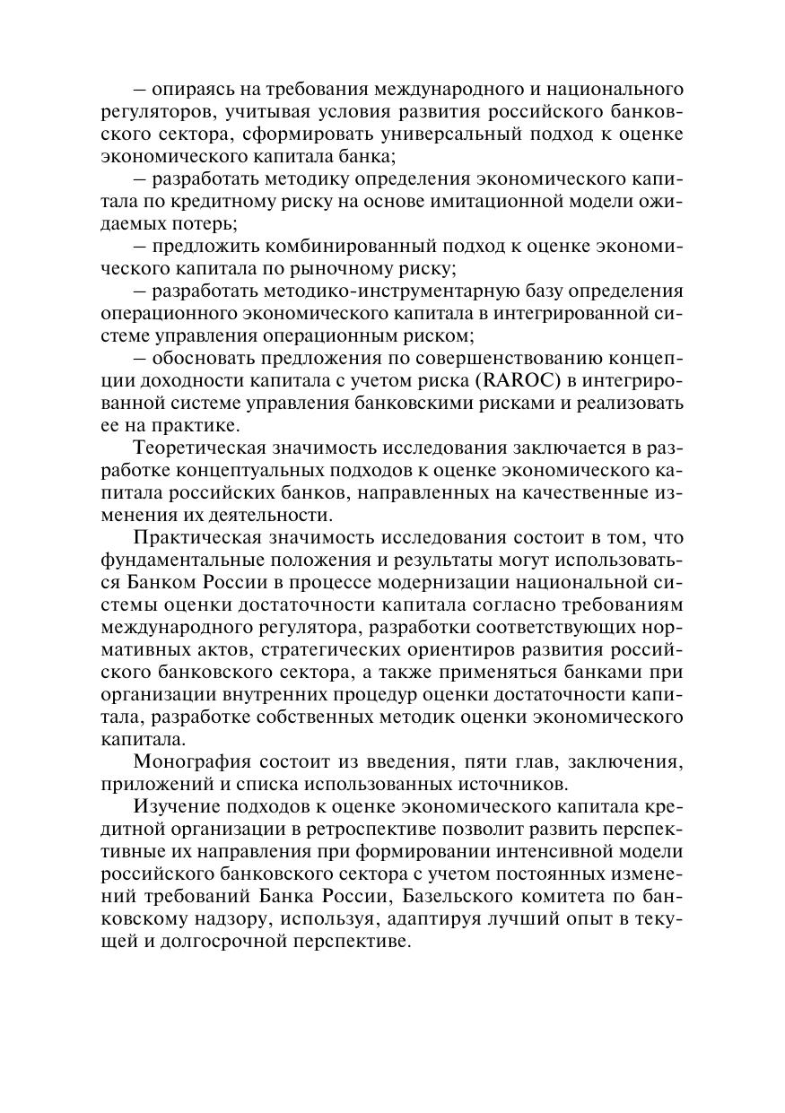 Предложены альтернативные подходы к оценке экономического капитала кредитной организации в условиях формирования интенсивной модели российского банковского сектора. С учетом международного (Базель II, III) и национального опыта разработаны методики оценки экономического капитала по кредитному, рыночному, операционному рискам в интегрированной системе управления банковскими рисками, реализована риск-ориентированная концепция оценки эффективности экономического капитала. Осуществлена их практическая апробация в российских банках.