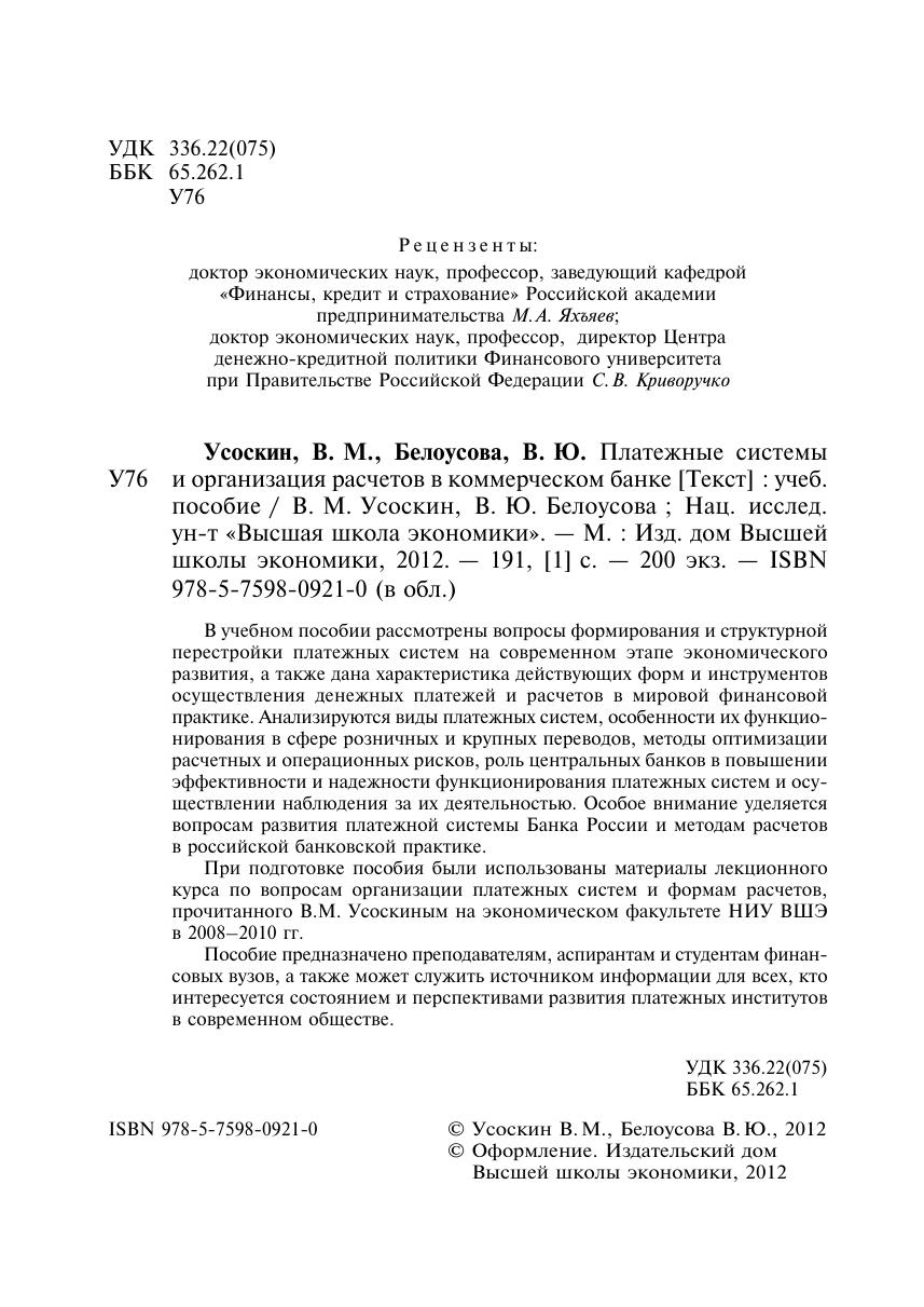 В учебном пособии рассмотрены вопросы формирования и структурной перестройки платежных систем на современном этапе экономического развития, а также дана характеристика действующих форм и инструментов осуществления денежных платежей и расчетов в мировой финансовой практике. Анализируются виды платежных систем, особенности их функционирования в сфере розничных и крупных переводов, методы оптимизации расчетных и операционных рисков, роль центральных банков в повышении эффективности и надежности функционирования платежных систем и осуществлении наблюдения за их деятельностью. Особое внимание уделяется вопросам развития платежной системы Банка России и методам расчетов в российской банковской практике. При подготовке пособия были использованы материалы лекционного курса по вопросам организации платежных систем и формам расчетов, прочитанного В.М. Усоскиным на экономическом факультете НИУ ВШЭ