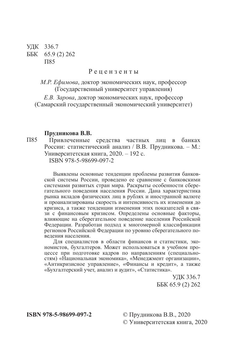 Выявлены основные тенденции проблемы развития банковской системы России, проведено ее сравнение с банковскими системами развитых стран мира. Раскрыты особенности сберегательного поведения населения России. Дана характеристика рынка вкладов физических лиц в рублях и иностранной валюте и проанализированы скорость и интенсивность их изменения до кризиса, а также тенденции изменения этих показателей в связи с финансовым кризисом. Определены основные факторы, влияющие на сберегательное поведение населения Российской Федерации. Разработан подход к многомерной классификации регионов Российской Федерации по уровню сберегательного поведения населения. Для специалистов в области финансов и статистики, экономистов, бухгалтеров. Может использоваться в учебном процессе при подготовке кадров по направлениям (специальностям) «Национальная экономика», «Менеджмент организации», «Антикризисное управление», «Финансы и кредит», а также «Бухгалтерский учет, анализ и аудит», «Статистика».