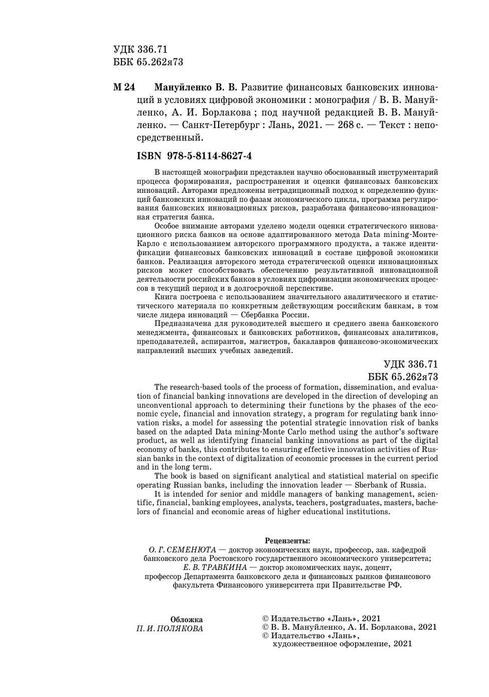 The book is based on significant analytical and statistical material on specific operating Russian banks, including the innovation leader – Sberbank of Russia.