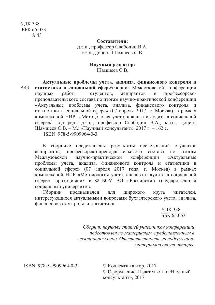 В сборнике представлены результаты исследований студентов аспирантов, профессорско-преподавательского состава по итогам Межвузовской научно-практической конференции «Актуальные проблемы учета, анализа, финансового контроля и статистики в социальной сфере» (07 апреля 2017 года, г. Москва) в рамках комплексной НИР «Методология учета, анализа и аудита в социальной сфере», проходивших в ФГБОУ ВО «Российский государственный социальный университет».