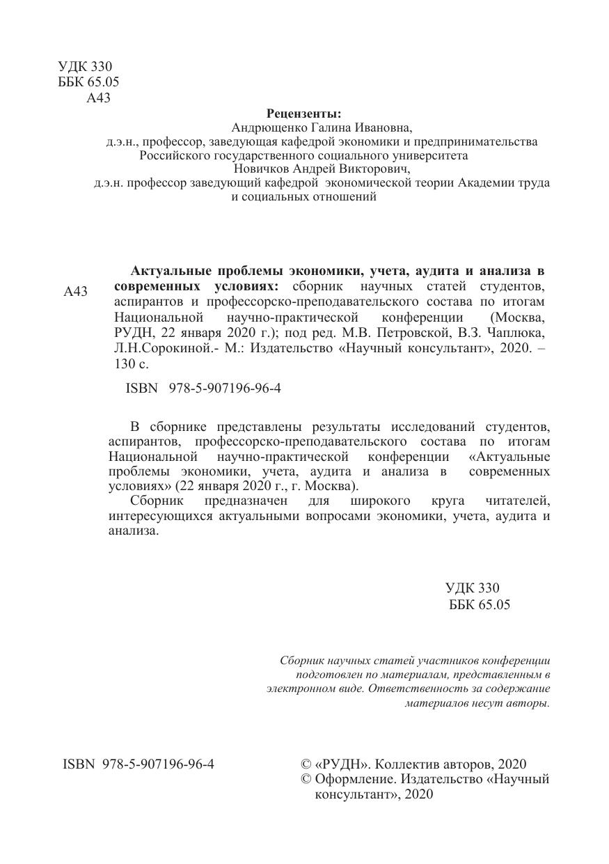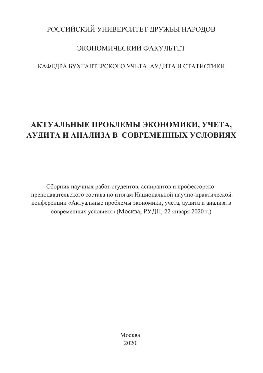 В сборнике представлены результаты исследований студентов, аспирантов, профессорско-предпринимательского состава по итогам Межвузовской научно-практической конференции «Актуальные проблемы экономики, учета, аудита и анализа в современных условиях» (22 января 2020г., г. Москва).