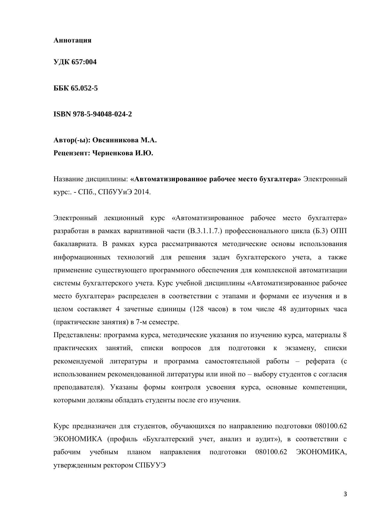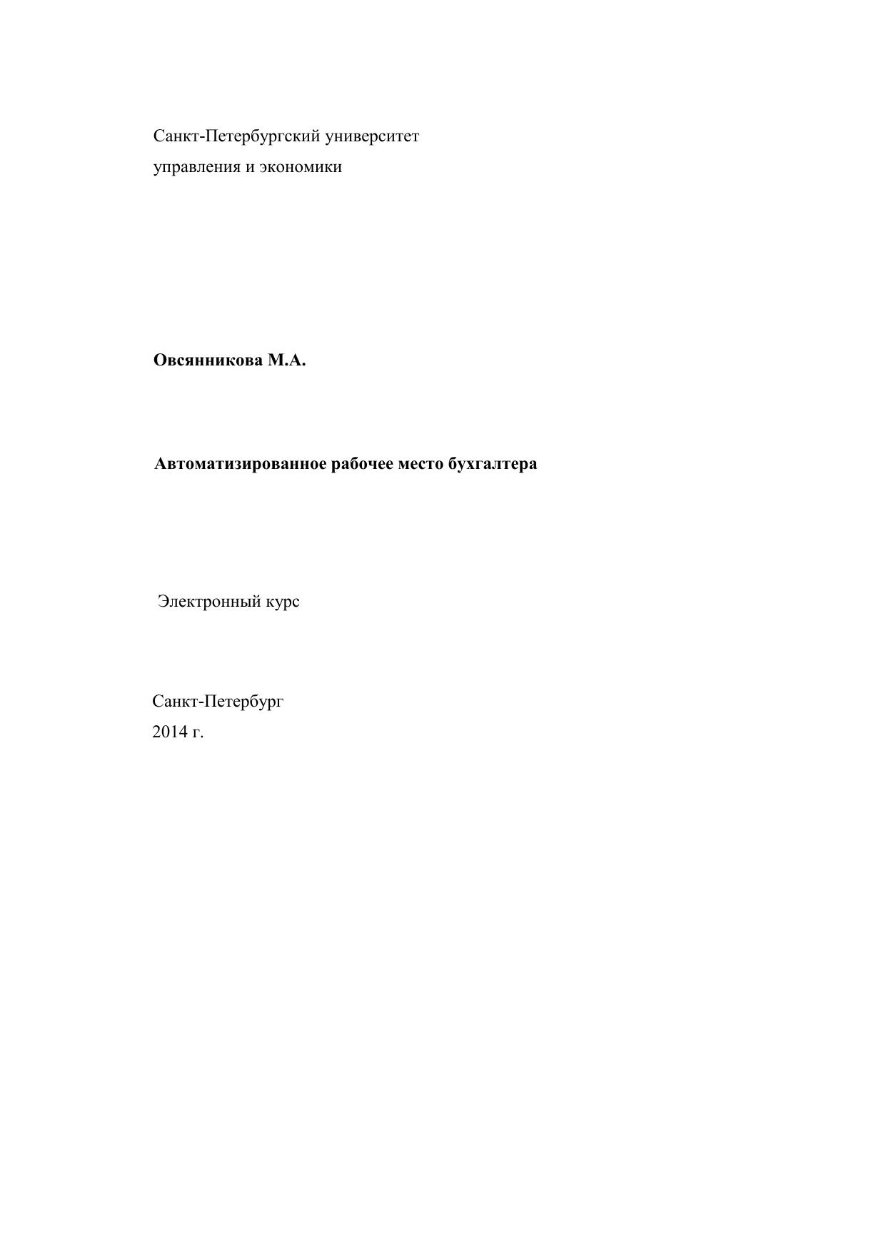 Электронный лекционный курс «Автоматизированное рабочее место бухгалтера» разработан в рамках вариативной части (В.3.1.1.7.) профессионального цикла (Б.3) ОПП бакалавриата. В рамках курса рассматриваются методические основы использования информационных технологий для решения задач бухгалтерского учета, а также применение существующего программного обеспечения для комплексной автоматизации системы бухгалтерского учета. Курс учебной дисциплины «Автоматизированное рабочее место бухгалтера» распределен в соответствии с этапами и формами ее изучения и в целом составляет 4 зачетные единицы (128 часов) в том числе 48 аудиторных часа (практические занятия) в 7-м семестре. Представлены: программа курса, методические указания по изучению курса, материалы 8 практических занятий, списки вопросов для подготовки к экзамену, списки рекомендуемой литературы и программа самостоятельной работы – реферата (с использованием рекомендованной литературы или иной по – выбору студентов с согласия преподавателя). Указаны формы контроля усвоения курса, основные компетенции, которыми должны обладать студенты после его изучения. Курс предназначен для студентов, обучающихся по направлению подготовки 080100.62 ЭКОНОМИКА (профиль «Бухгалтерский учет, анализ и аудит»), в соответствии с рабочим учебным планом направления подготовки 080100.62 ЭКОНОМИКА, утвержденным ректором СПБУУЭ