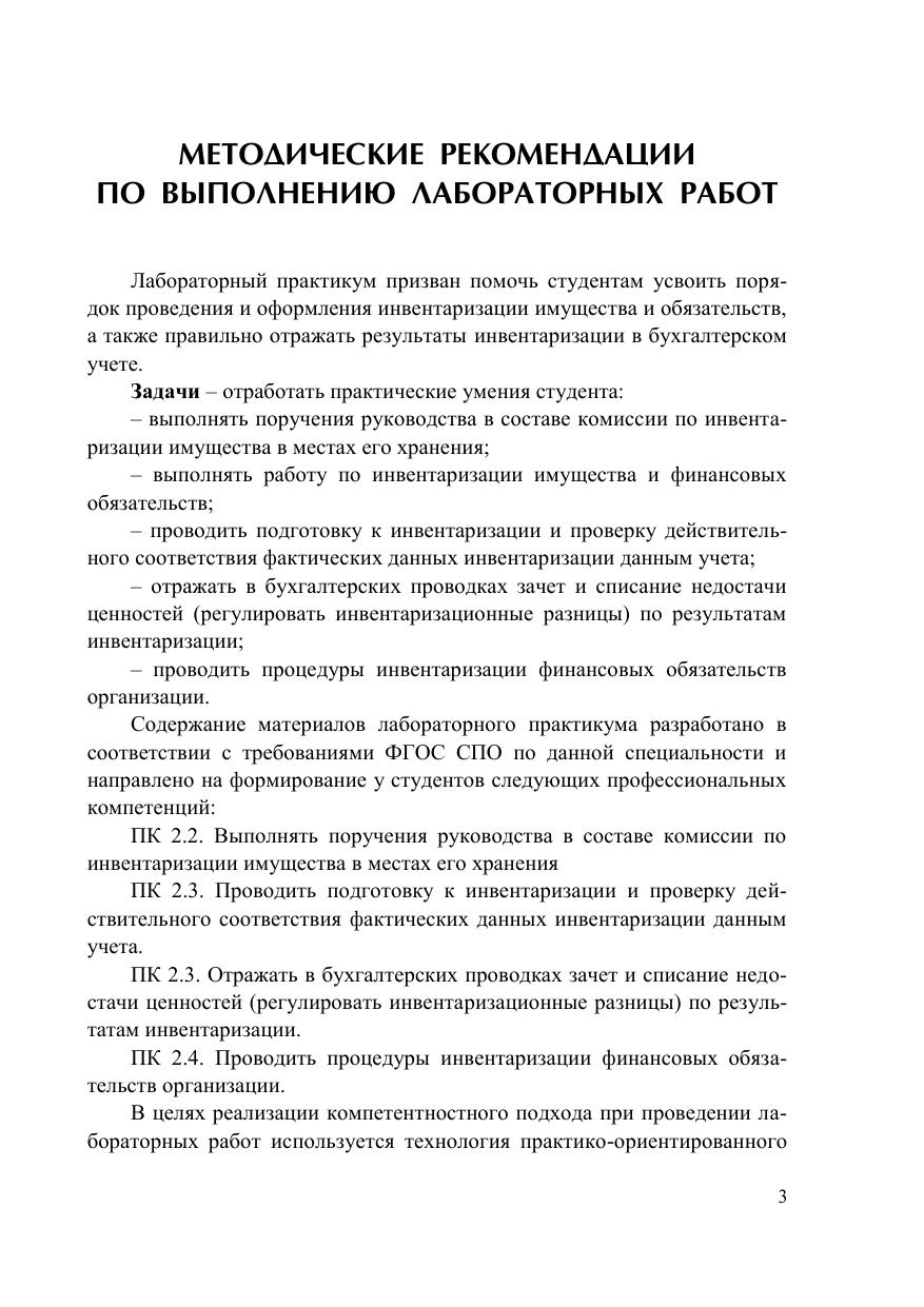 Лабораторный практикум включает в себя комплекс практических учебных заданий по междисциплинарному курсу МДК 02.02. «Бухгалтерская технология проведения и оформления ин-вентаризации» профессионального модуля ПМ 02. Практические задания направлены на формирование и развитие необходимых умений, профессиональных компетенций студентов, приобретение ими практического опыта по составлению бухгалтерской докумен-тации. Предназначен для использования на практических занятиях, а также для организации и обеспечения эффективной самостоя-тельной аудиторной работы студентов по специальности среднего профессионального образования 38.02.01 Экономика и бухгалтерский учет (по отраслям) базовой и углубленной подготовки.