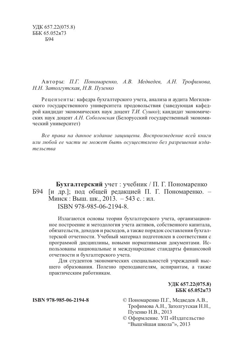 Излагаются основы теории бухгалтерского учета, организационное построение и методология учета активов, собственного капитала, обязательств, доходов и расходов, а также порядок составления бухгалтерской отчетности. Учебный материал подготовлен в соответствии с программой дисциплины, новыми нормативными документами.Использованы национальные и международные стандарты финансовой отчетности и бухгалтерского учета. Для студентов экономических специальностей вузов. Полезно преподавателям, аспирантам, а также практикующим работникам.