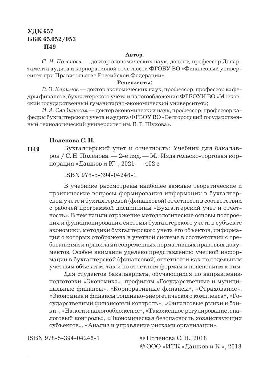 В учебнике рассмотрены наиболее важные теоретические и практические вопросы формирования информации в бухгалтерском учете и бухгалтерской (финансовой) отчетности в соответствии с рабочей программой дисциплины "Бухгалтерский учет и отчетность". в нем нашли отражение методологические основы построения и функционирования системы бухгалтерского учета в субъекте экономики, методики бухгалтерского учета его объектов, информация о которых отображена в учетной системе в соответствии с требованиями и правилами современных нормативных правовых документов. Особое внимание уделено представлению учетной информации в бухгалтерской (финансовой) отчетности как по отдельным учетным объектам, так и по отчетным формам и пояснениям к ним. Для студентов бакалавриата, обучающихся по направлению подготовки "Экономика", профилям "Государственные и муниципальные финансы", "Корпоративные финансы", "Страхование", "экономика и финансы топливно-энергетического комплекса", "Государственный финансовый контроль", "Финансовые риски и банки", "Налоги и налогообложение", "Таможенное регулирование и налоговый контроль", "Экономическая безопасность хозяйствующих субъектов", "Анализ и управление рисками организации"
