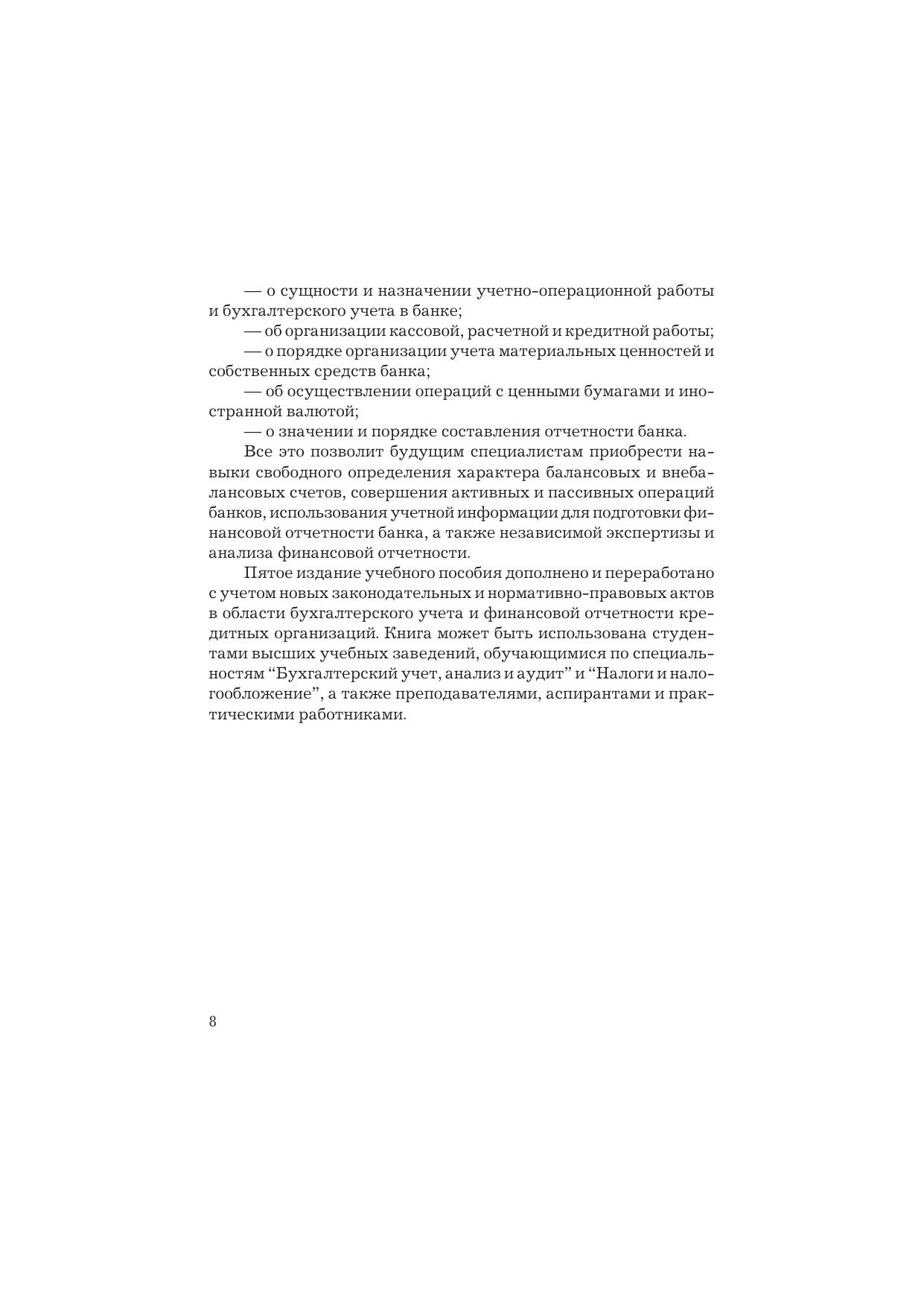 В учебном пособии, написанном в соответствии с Государственным образовательным стандартом высшего профессионального образования, раскрываются теоретические и практические вопросы техники и форм бухгалтерского учета, структуры банка и его бухгалтерии, учета расчетных, кассовых, кредитных, депозитных операций, правильной организации документооборота, межбанковские операции. В книге приводится методика бухгалтерского учета в кредитных организациях, основанная на современных требованиях Центрального банка и законодательно-правовых актах Российской Федерации. Для студентов вузов, обучающихся по экономическим специальностям, а также преподавателей, аспирантов, профессиональных бухгалтеров и менеджеров.