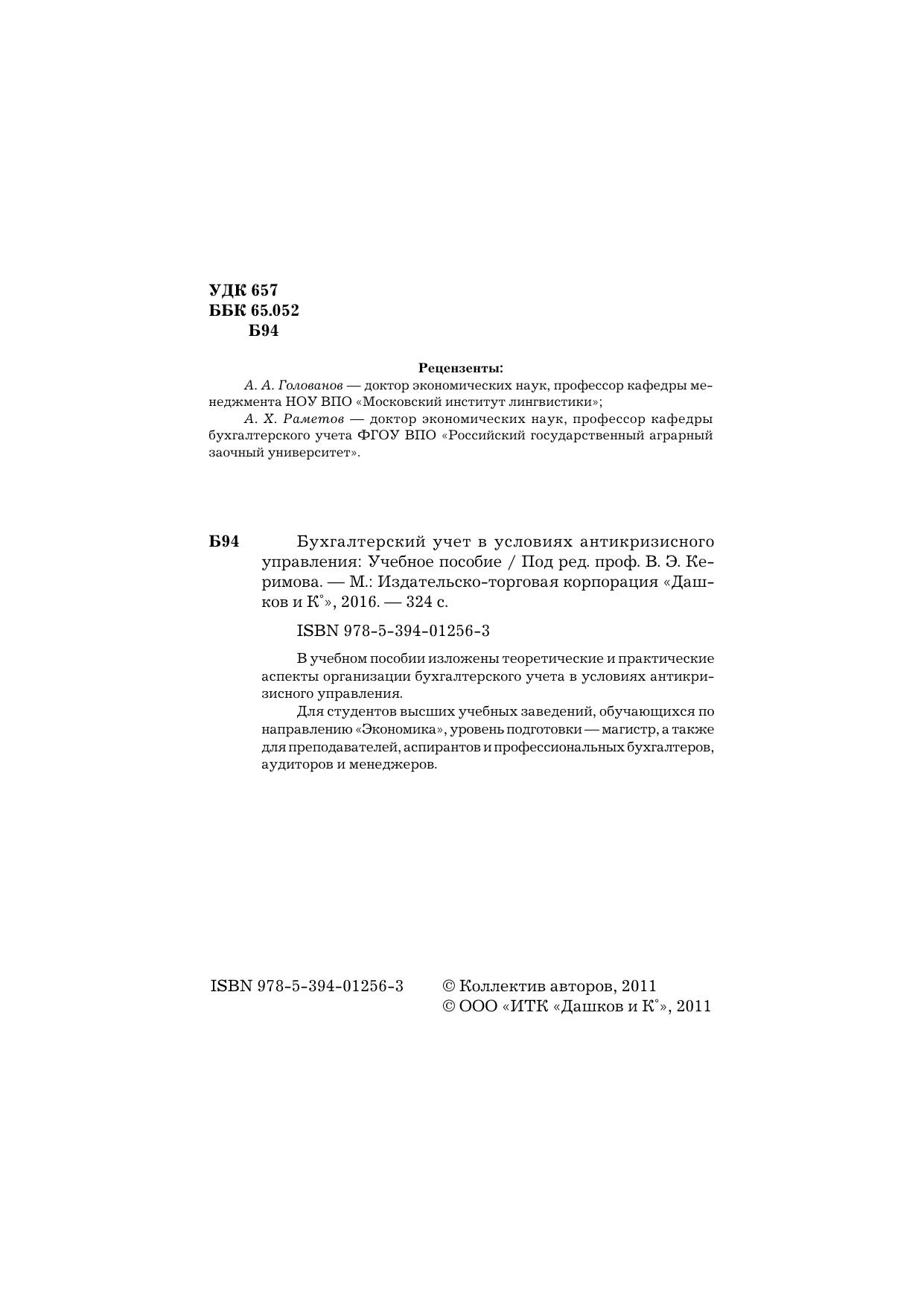 В учебном пособии изложены теоретические и практические аспекты организации бухгалтерского учета в условиях антикризисного управления. Для студентов высших учебных заведений, обучающихся по направлению «Экономика», уровень подготовки — магистр, а также для преподавателей, аспирант